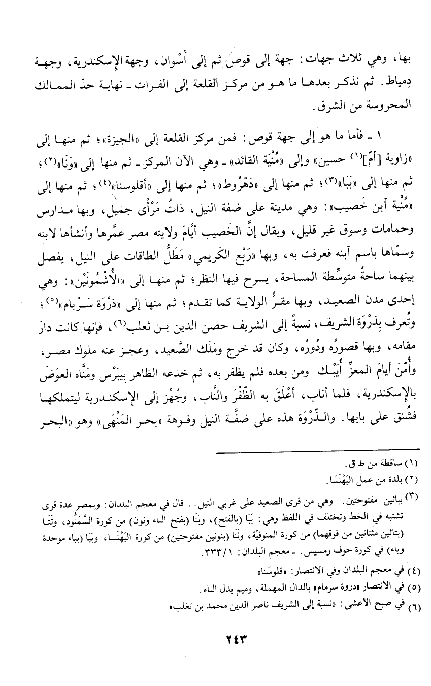 بها، وهي ثلاث جهات: جهة إلى قوص ثم إلى أسوان، وجهة الإسكندرية، وجهة دمياط. ثم نذكر بعدها ما هو من مركز القلعة إلى الفرات - نهاية حد الممالك المحروسة من الشرق.