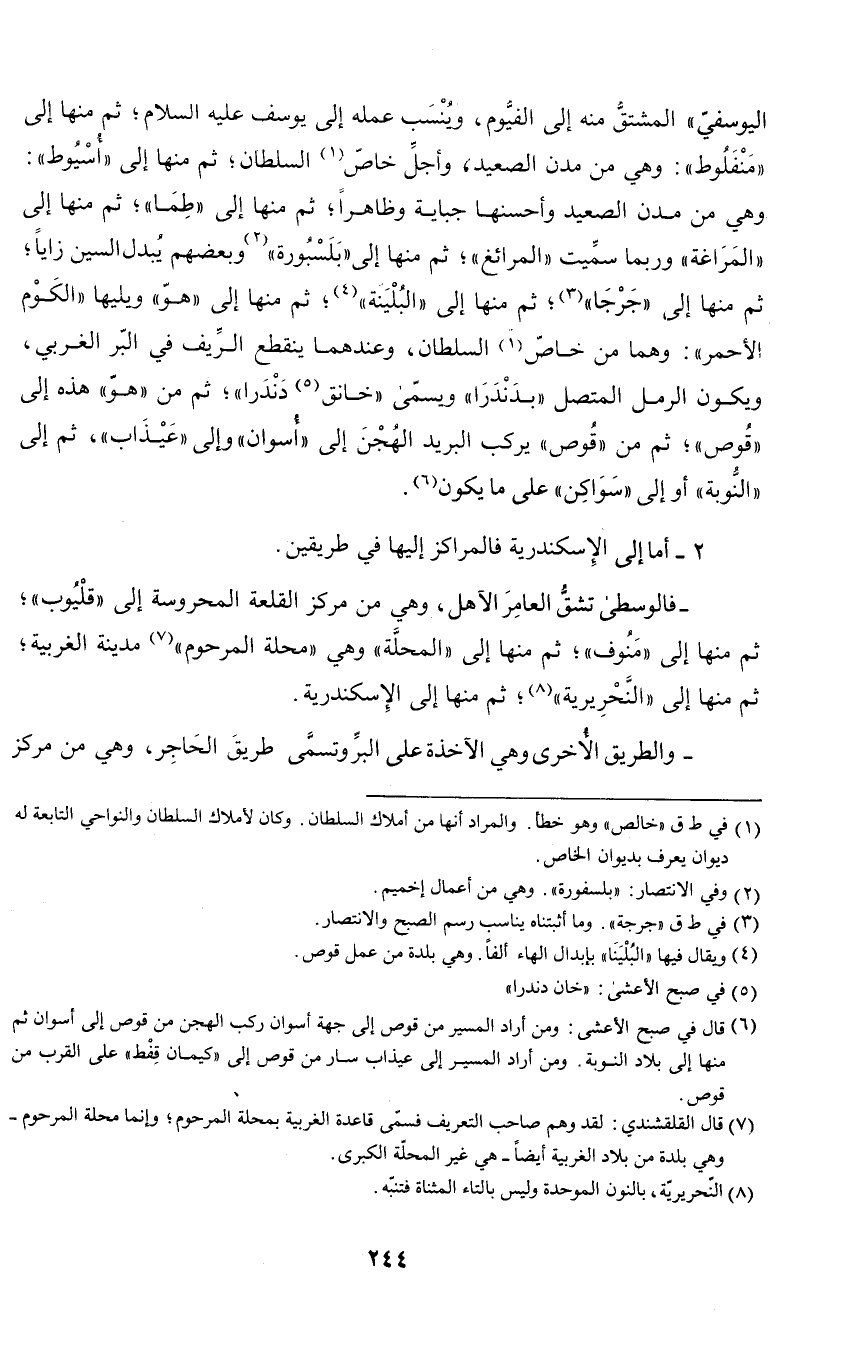 اليوسفي) المشتق منه إلى الفيوم، وينسب عمله إلى يوسف عليه السلام؛ ثم منها إلى (منفلوط): وهي من مدن الصعيد، وأجل خاص السلطان؛ ثم منها إلى (أسيوط): وهي من مدن الصعيد وأحسنها جباية وظاهرا؛ ثم منها إلى (طما)؛ ثم منها إلى (المراغة) وربما سميت المرائغ؛ ثم منها إلى (بلسبورة) وبعضهم يبدل السين زايا؛ ثم منها إلى (جرجا)؛ ثم منها إلى (البلينة)؛ ثم منها إلى (هو) ويليها (الكوم الأحمر): وهما من خاص السلطان، وعندهما ينقطع الريف في البر الغربي، ويكون الرمل المتصل (بدندرا) ويسمى (خانق دندرا)؛ ثم من (هو) هذه إلى (قوص)؛ ثم من (قوص) يركب البريد الهجن إلى (أسوان) وإلى (عيذاب)، ثم إلى (النوبة) أو إلى (سواكن) على ما يكون.