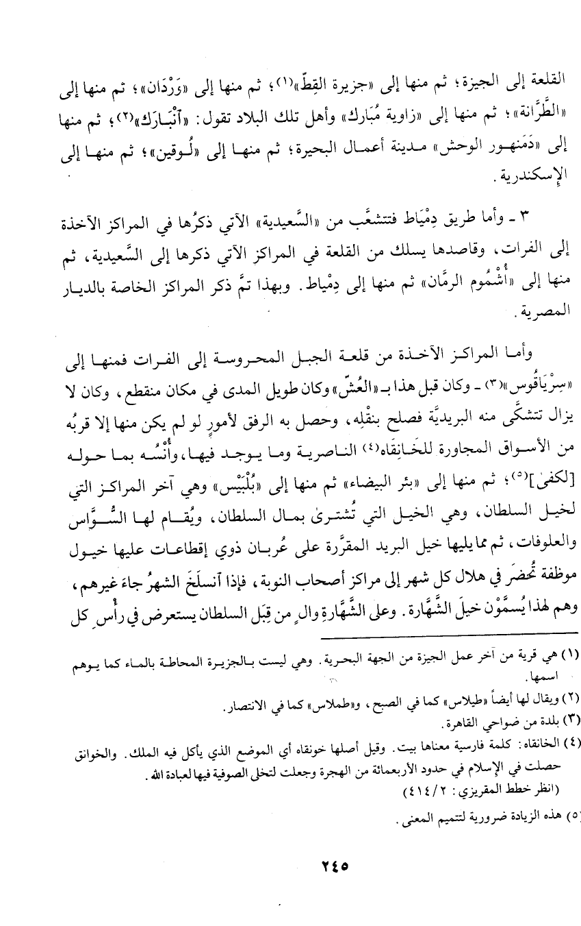 المجاورة للخانقاه الناصرية وما يوجد فيها، وأنسه بما حوله لكفى؛ ثم منها إلى (بئر البيضاء) ثم منها إلى (بلبيس) وهي آخر المراكز التي لخيل السلطان، وهي الخيل التي تشترى بمال السلطان، ويقام لها السواس والعلوفات، ثم مما يليها خيل البريد المقررة على عربان ذوي إقطاعات عليها خيول موظفة تحضر في هلال كل شهر إلى مراكز أصحاب النوبة، فإذا انسلخ الشهر جاء غيرهم، وهم لهذا يسمون خيل الشهارة؛ وعلى الشهارة وال من قبل السلطان يستعرض في رأس كل
