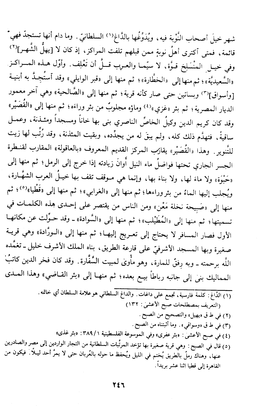 شهر خيل أصحاب النوبة فيه، ويدوغها بالداغ السلطاني. وما دام أنها تستجد فهي قائمة، فمتى اكترى أهل نوبة ممن قبلهم تلفت المراكز، إذ كان لا يهل الشهر وفي خيل المنسلخ قوة، ولا سيما والعرب قل أن تعلف. وأول هذه المراكز (السعيدية)؛ ثم منها إلى (الخطارة)؛ ثم منها إلى (قبر الوايلي) وقد استجد به أبنية وأسواق وبساتين حتى صار كأنه قرية؛ ثم منها إلى (الصالحية) وهي آخر معمور الديار المصرية؛ ثم بئر (غزي) وماؤه مجلوب من بئر وراءه؛ ثم منها إلى (القصير) وقد كان وكريم الدين وكيل الخاص الناصري بنى بها خانا ومسجدا ومئذنة، وعمل ساقية، فتهدم ذلك كله، ولم يبق له من يجدده، وبقيت المئذنة، وقد رتب لها زيت للتنوير، وهذا (القصير) يقارب المركز القديم المعروف (بالعاقولة) المقارب لقنطرة الجسر الجاري تحتها فواضل ماء النيل أوان زيادته إذا خرج إلى الرمل؛ ثم منها إلى (حبوة) ولا ماء لها، ولا بناء بها، وإنما هي موقف تقف بها خيل العرب الشهارة، ويجلب إليها الماء من بئر وراءها؛ ثم منها إلى (الغرابي)؛ ثم منها إلى (قطيا) ثم منها إلى (صبيحة نخلة معن) ومن الناس من يختصر على إحدى هذه الكلمات في تسميتها؛ ثم منها إلى (المطيلب)؛ ثم منها إلى (السوادة) - وقد حولت عن مكانها الأول فصار المسافر لا يحتاج إلى تعريج إليها؛ ثم منها إلى (الورادة) وهي قرية صغيرة وبها المسجد الأشرفي على قارعة الطريق، بناه الملك الأشرف خليل - تغمده الله برحمته - وبه رفق للمارة، وهو مأوى لمبيت السفارة. وقد كان فخر الدين كاتب المماليك بنى إلى جانبه رباطا بيع بعده؛ ثم منها إلى (بئر القاضي) وهذا المدى