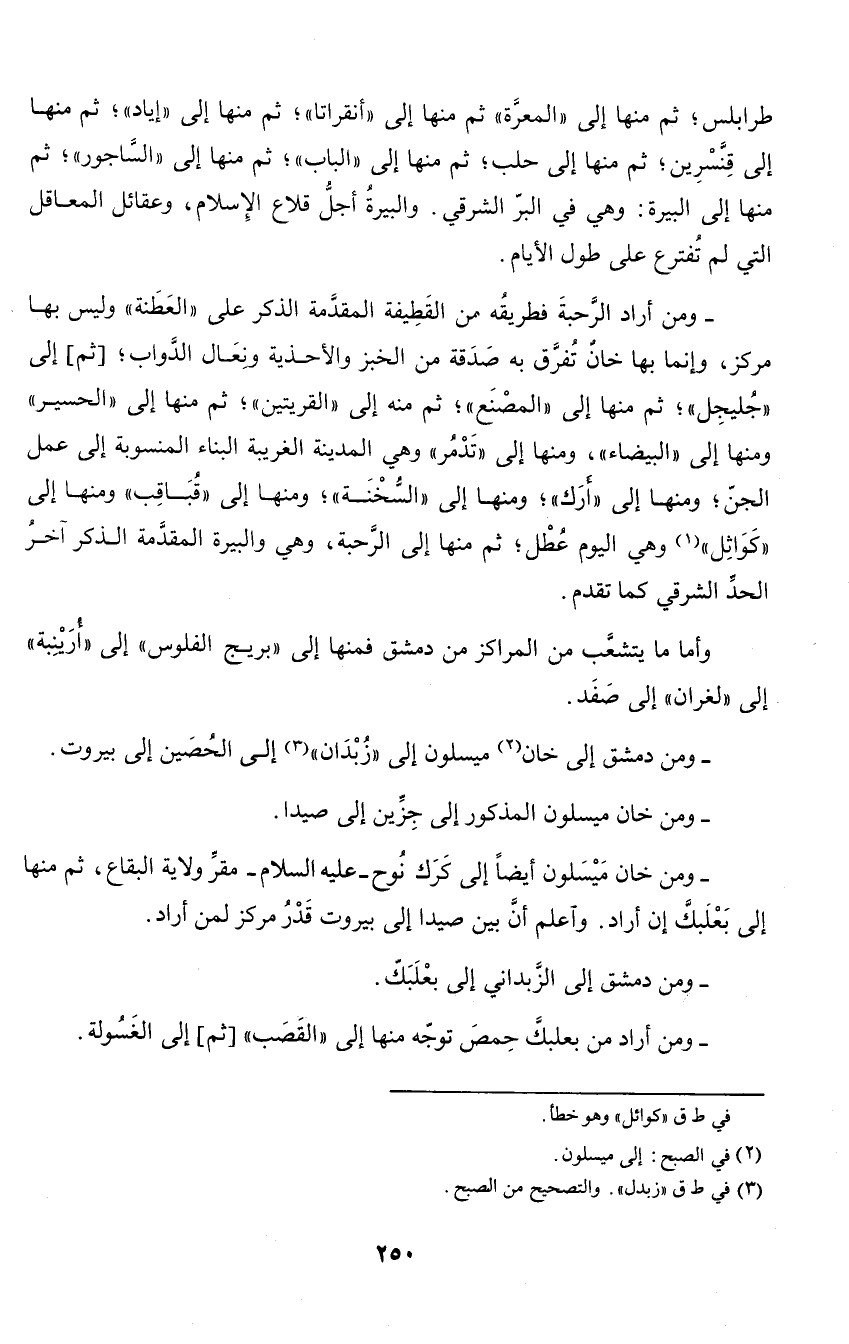 - ومن خان ميسلون أيضا إلى كرك نوح - عليه السلام - مقر ولاية البقاع، ثم منها إلى بعلبك إن أراد. واعلم أن بين صيدا إلى بيروت قدر مركز لمن أراد.