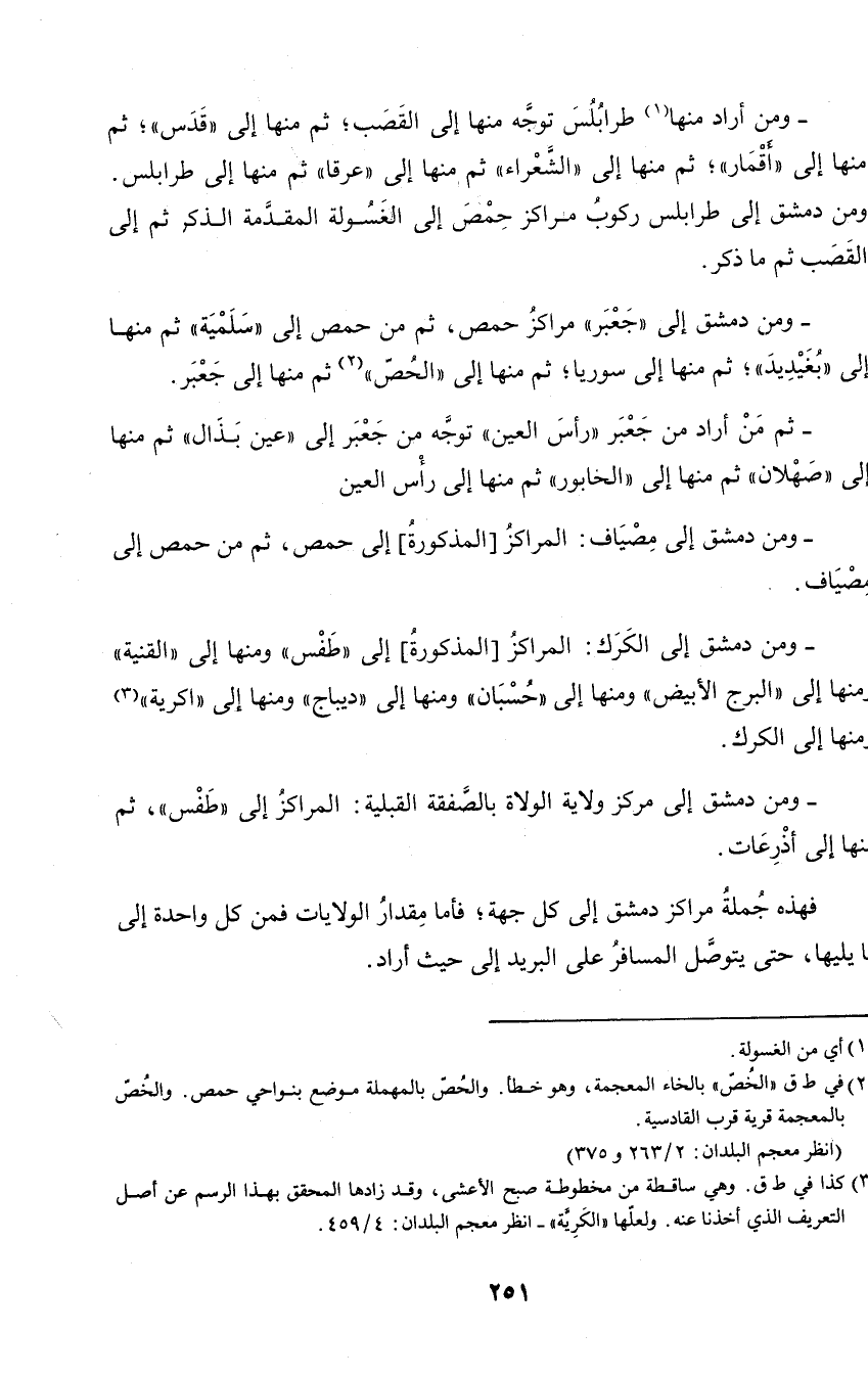 - ومن دمشق إلى (جعبر) مراكز حمص، ثم من حمص إلى (سليمة) ثم منها إلى (بغيديد)؛ ثم منها إلى سوريا؛ ثم منها إلى (الحص) ثم منها إلى جعبر.