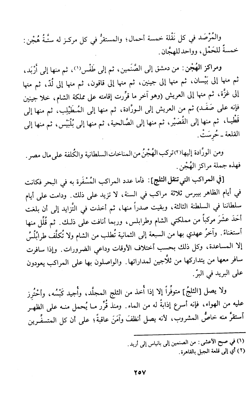 ومراكز الهجن: من دمشق إلى الصنمين، ثم إلى طفس، ثم منها إلى أربد، ثم منها إلى بيسان، ثم منها إلى جنين، ثم منها إلى قاقون، ثم منها إلى لد، ثم منها إلى غزة، ثم منها إلى العريش (وهو آخر ما قررت إقامته على مملكة الشام، خلا جينين فإنه على صفد) ثم من