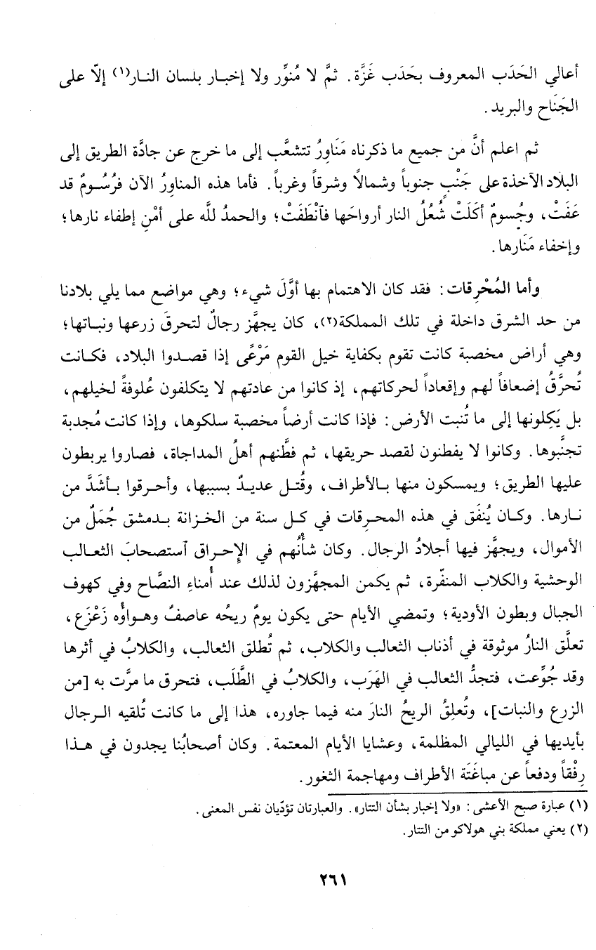 وأما المحرقات: فقد كان الاهتمام بها أول شيء؛ وهي مواضع مما يلي بلادنا من حد الشرق داخلة في تلك المملكة، كان يجهز رجال لتحرق زرعها ونباتها؛ وهي أراض مخصبة كانت تقوم بكفاية خيل القوم مرعى إذا قصدوا البلاد، فكانت تحرق إضعافا لهم وإقعادا لحركاتهم، إذ كانوا من عادتهم لا يتكلفون علوفة لخيلهم، بل يكلونها إلى ما تنبت الأرض: فإذا كانت أرضا مخصبة سلكوها، وإذا كانت مجد تجنبوها. وكانوا لا يفطنون لقصد حريقها، ثم فطنهم أهل المداجاة، فصاروا يربطون عليها الطريق؛ ويمسكون منها بالأطراف، وقتل عديد بسببها، وأحرقوا بأشد من نارها. ولكن ينفق في هذه المحرقات في كل سنة من الخزانة بدمشق جمل من الأموال، ويجهز فيها أجلاد الرجال. وكان شأنهم في الإحراق استصحاب الثعالب الوحشية والكلاب المنفرة، ثم يكمن المجهزون لذلك عند أمناء النصاح وفي كهوف الجبال وبطون الأودية؛ وتمضي الأيام حتى يكون يوم ريحه عاصف وهواؤه زعزع، تعلق النار موثوقة في أذناب الثعالب والكلاب، ثم تطلق الثعالب، والكلاب في أثرها وقد جوعت، فتجد الثعالب في الهرب، والكلاب في الطلب، فتحرق ما مرت به من الزرع والنبات، وتعلق الريح النار منه فيما جاوره، هذا إلى ما كانت تلقيه الرجال بأيديها في الليالي المظلمة، وعشايا الأيام المعتمة. وكان أصحابنا يجدون في هذا رفقا ودفعا عن مباغتة الأطراف ومهاجمة الثغور.