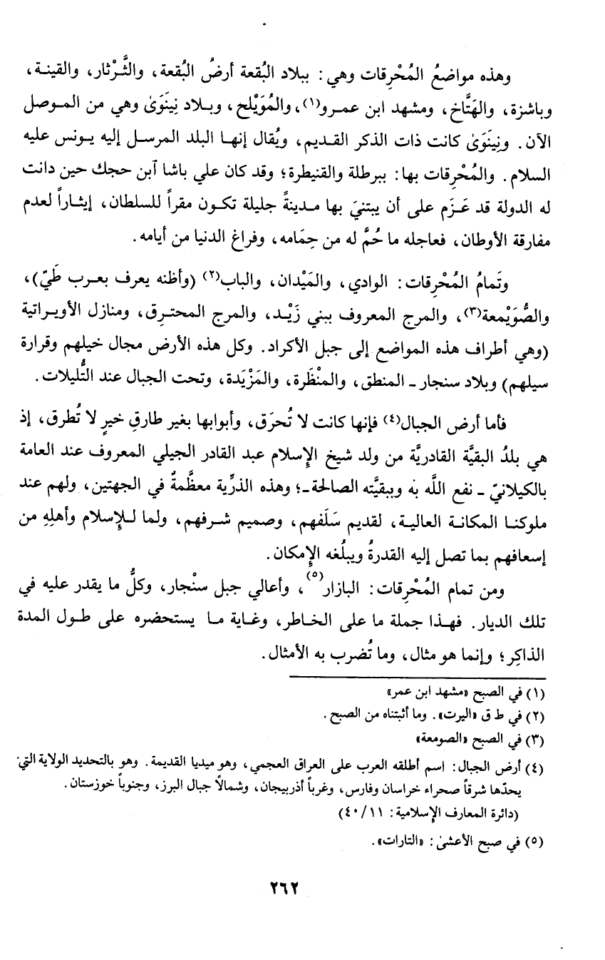 وتمام المحرقات: الوادي، والميدان، والباب (وأظنه يعرف بعرب طي)، والصويمعة، والمرج المعروف ببني زيد، والمرج المحترق، ومنازل الأويراتية (وهي أطراف هذه المواضع إلى جبل الأكراد. وكل هذه الأرض مجال خيلهم وقرارة سيلهم) وبلاد سنجار - المنطق، والمنظرة، والمزيدة، وتحت الجبال عند التليلات.