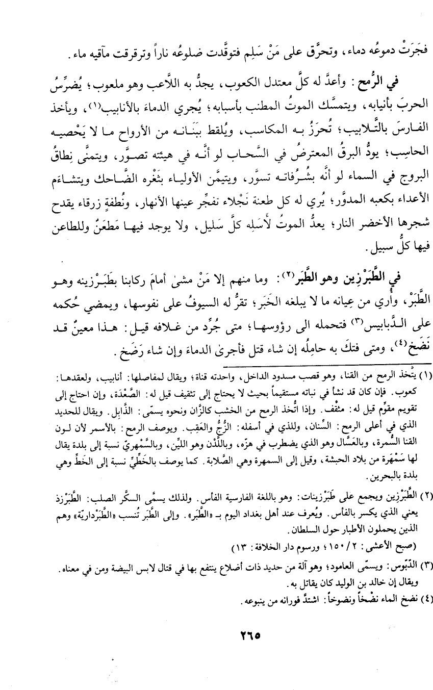 في الطبرزين وهو الطبر: وما منهم إلا من مشى أمام ركابنا بطبرزينه وهو الطبر، وأري من عيانه ما لا يبلغه الخبر؛ تقر له السيوف على نفوسها، ويمضي حكمه على الدبابيس فتحمله إلى رؤوسها؛ متى جرد من غلافه قيل: هذا معين قد نضخ؛ ومتى فتك به حامله إن شاء قتل فأجرى الدماء وإن شاء رضخ.