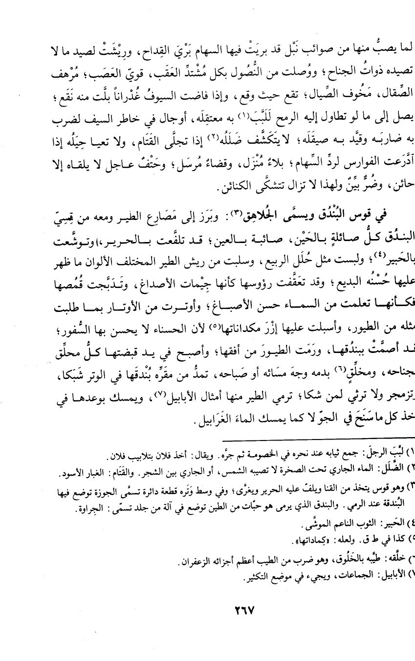 في قوس البندق ويسمى الجلاهق: وبرز إلى مصارع الطير ومعه من قسي البندق كل صائلة بالحين، صائبة بالعين؛ قد تلفعت بالحرير، وتوشعت بالحبير؛ ولبست مثل حلل الربيع، وسلبت من ريش الطير المختلف الألوان ما ظهر عليها حسنه البديع؛ وقد تعقفت رؤوسها كأنها جيمات الأصداغ، وتدبجت قموصها فكأنها تعلمت من السماء حسن الأصباغ؛ وأوترت من الأوتار بما طلبت مثله من الطيور، وأسبلت عليها أزر مكداناتها لأن الحسناء لا يحسن بها السفور، قد أصمت ببندقها، ورمت الطيور من أفقها؛ وأصبح في يد قبضتها كل محلق بجناحه، ومخلق بدمه وجه مسائه أو صباحه، تمد من مقره بندقها في الوتر شبكا، وتزمجر ولا ترثي لمن شكا؛ ترمي الطير منها أمثال الأبابيل، ويمسك بوعدها في أخذ كل ما سنح في الجو لا كما يمسك الماء الغرابيل.