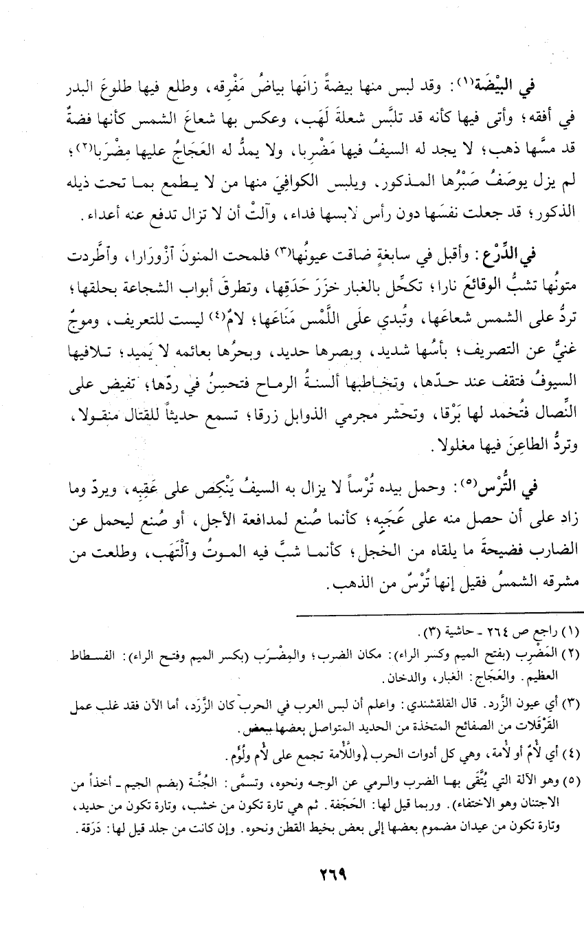 في الدرع: وأقبل في سابغة ضاقت عيونها فلمحت المنون ازورارا، واطردت متونها تشب الوقائع نارا؛ تكحل بالغبار خزر حدقها، وتطرق أبواب الشجاعة بحلقها؛ ترد على الشمس شعاعها، وتبدي على اللمس مناعها؛ لام ليست للتعريف، وموج غني عن التصريف؛ بأسها شديد، وبصرها حديد، وبحرها بعائمه لا يميد؛ تلافيها السيوف فتقف عند حدها، وتخاطبها ألسنة الرماح فتحسن في ردها؛ تفيض على النصال فتخمد لها برقا، وتحشر مجرمي الذوابل زرقا؛ تسمع حديثا للقتال منقولا، ونرد الطاعن فيها مغلولا.