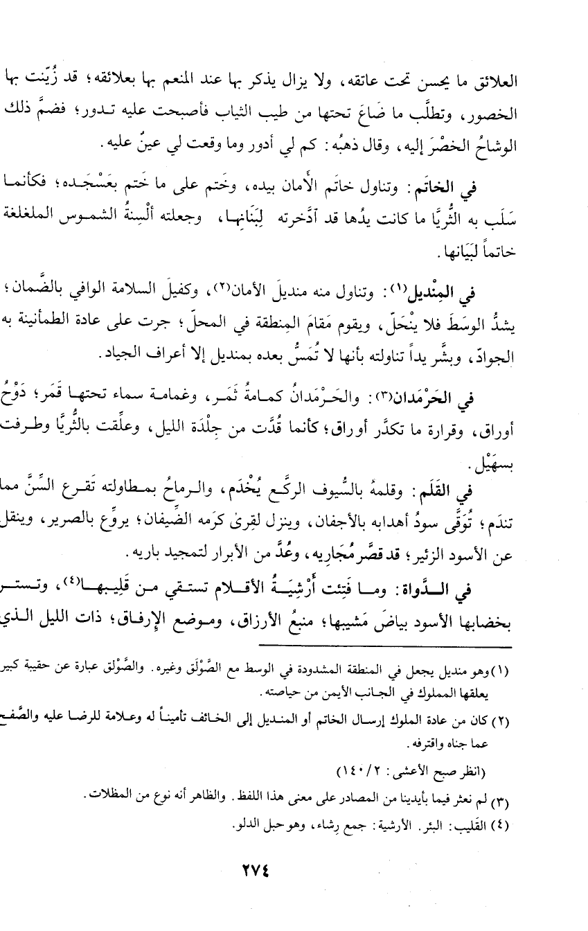 في المنديل: وتناول منه منديل الأمان، وكفيل السلامة الوافي بالضمان؛ يشد الوسط فلا ينحل، ويقوم مقام المنطقة في المحل؛ جرت على عادة الطمأنينة به الجواد، وبشر يدا تناولته بأنها لا تمس بعده بمنديل إلا أعراف الجياد.