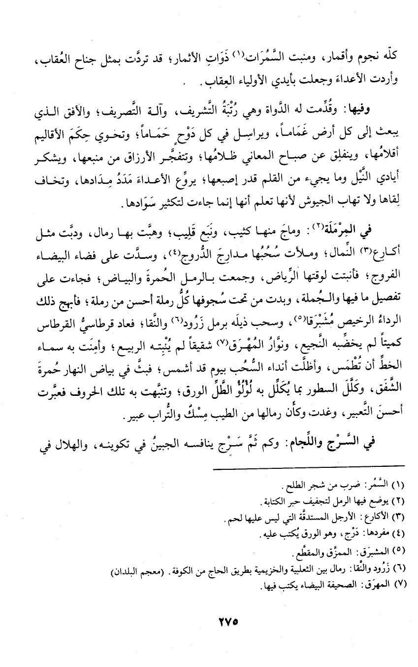 في المرملة: وماج منها كثيب، ونبع قليب؛ وهبت بها رمال، ودبت مثل أكارع النمال؛ وملأت سحبها مدارج الدروج، وسدت على فضاء البيضاء الفروج؛ فأنبتت لوقتها الرياض، وجمعت بالرمل الحمرة والبياض؛ فجاءت على تفصيل ما فيها والجملة، وبدت من تحت سجوفها كل رملة أحسن من رملة؛ فأبهج ذلك الرداء الرخيص مشبرقا، وسحب ذيله برمل زرود والنقا؛ فعاد قرطاسي القرطاس كميتا لم يخضبه النجيع، ونوار المهرق شقيقا لم ينبته الربيع؛ وأمنت به سماء الخط أن تطمس، وأظلت أنداء السحب بيوم قد أشمس؛ فبث في بياض النهار حمرة الشفق، وكلل السطور بما يكلل به لؤلؤ الطل الورق؛ وتنبهت به تلك الحروف فعبرت أحسن التعبير، وغدت وكأن رمالها من الطيب مسك والتراب عبير.
