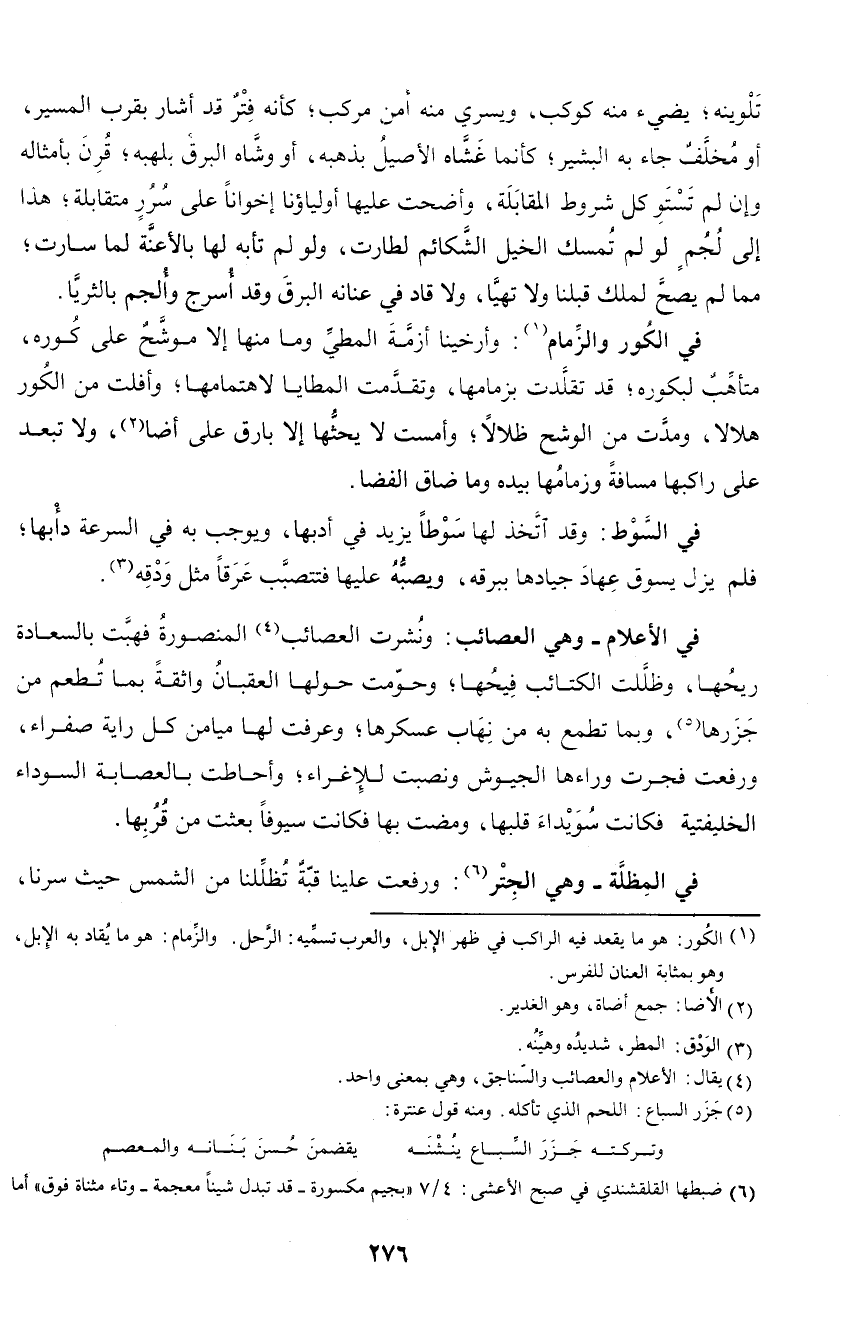 في الكور والزمام: وأرخينا أزمة المطي وما منها إلا موشح على كوره، متأهب لبكوره؛ قد تقلدت بزمامها، وتقدمت المطايا لاهتمامها؛ وأفلت من الكور هلالا، ومدت من الوشح ظلالا؛ وأمست لا يحثها إلا بارق على أضا، ولا تبعد على راكبها مسافة وزمامها بيده وما ضاق الفضا.