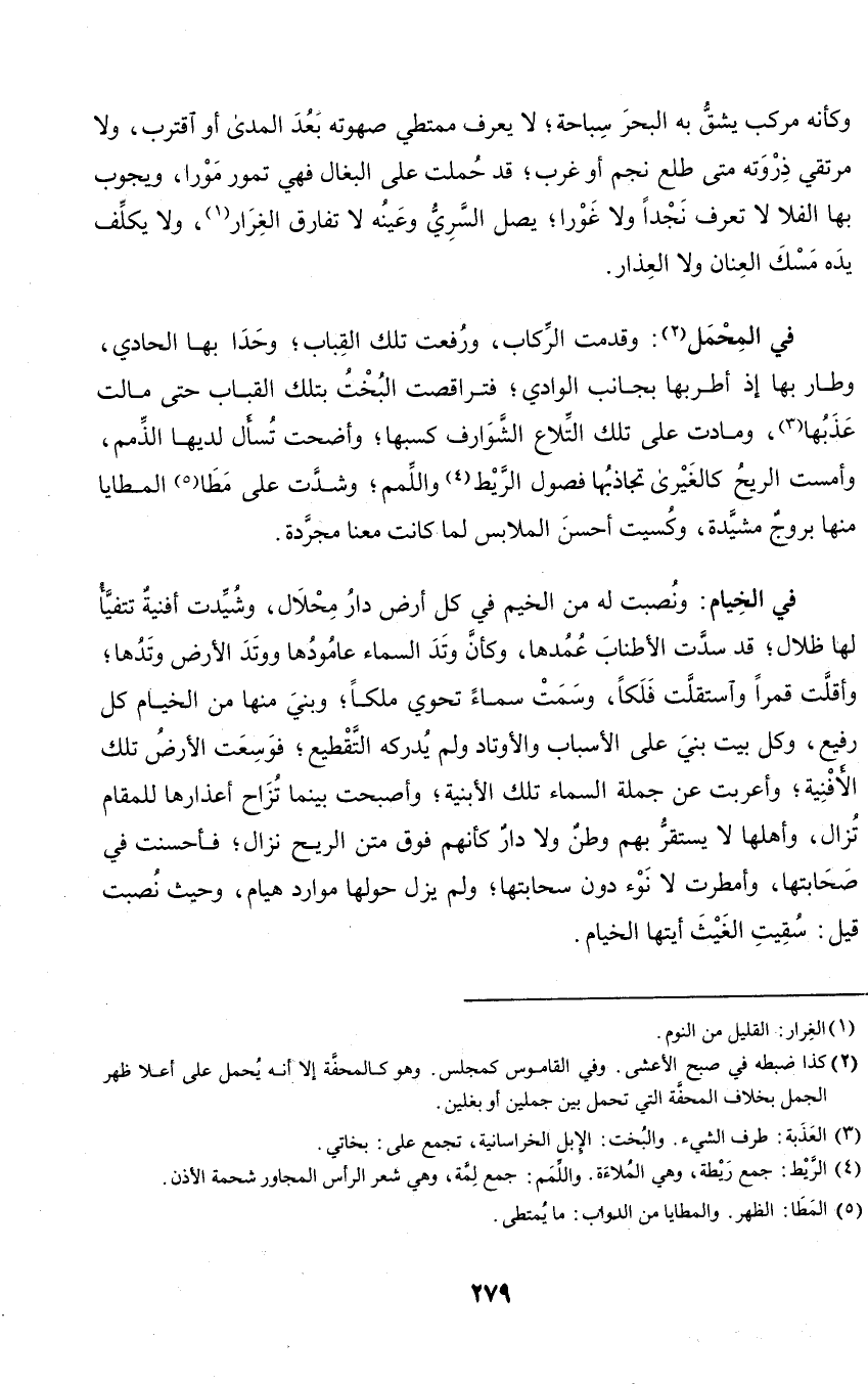 في المحمل: وقدمت الركاب، ورفعت تلك القباب؛ وحدا بها الحادي، وطار بها إذا أطربها بجانب الوادي؛ فتراقصت البخت بتلك القباب حتى مالت عذبها، ومادت على تلك التلاع الشوارف كسبها؛ وأضحت تسأل لديها الذمم، وأمست الريح كالغيرى تجاذبها فصول الريط واللمم؛ وشدت على مطا الطايا منها بروج مشيدة، وكسيت أحسن الملابس لما كانت معنا مجردة.
