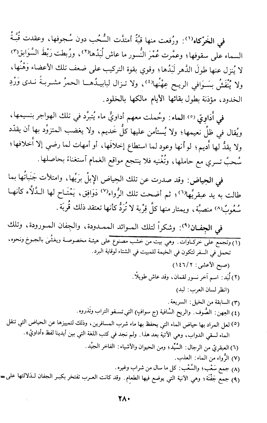 في الحياض: وقد صدرت عن تلك الحياض الإبل بريها، وامتلأت جنباتها بما طالت به يد عبقريتها؛ ثم أضحت تلك الرواء دوافق، يمتاح لها الدلاء كأنها سعوب منصبة، ويمتار منها كل قربة لا ترد كأنها تعتقد ذلك قربة.
