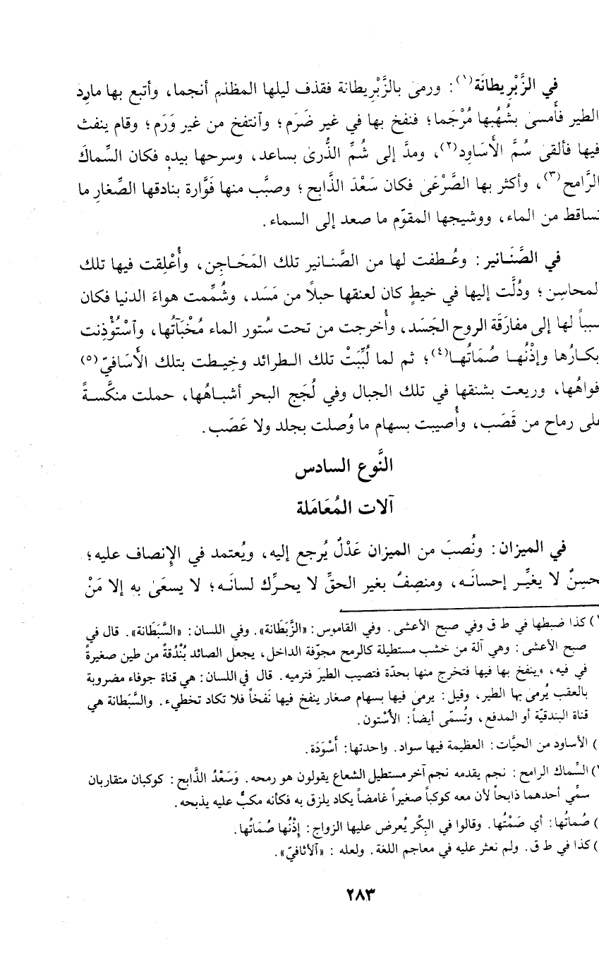 في الصنانير: وعطفت لها من الصنانير تلك المحاجن، وأعلقت فيها تلك المحاسن؛ ودلت إليها في خيط كان لعنقها حبلا من مسد، وشممت هواء الدنيا فكان سببا لها إلى مفارقة الروح الجسد، وأخرجت من تحت ستور الماء مخباتها، واستؤذنت أبكارها وإذنها صماتها؛ ثم لما لببت تلك الطرائد وخيطت بتلك الأسافي أفواهها، وريعت بشنقها في تلك الجبال