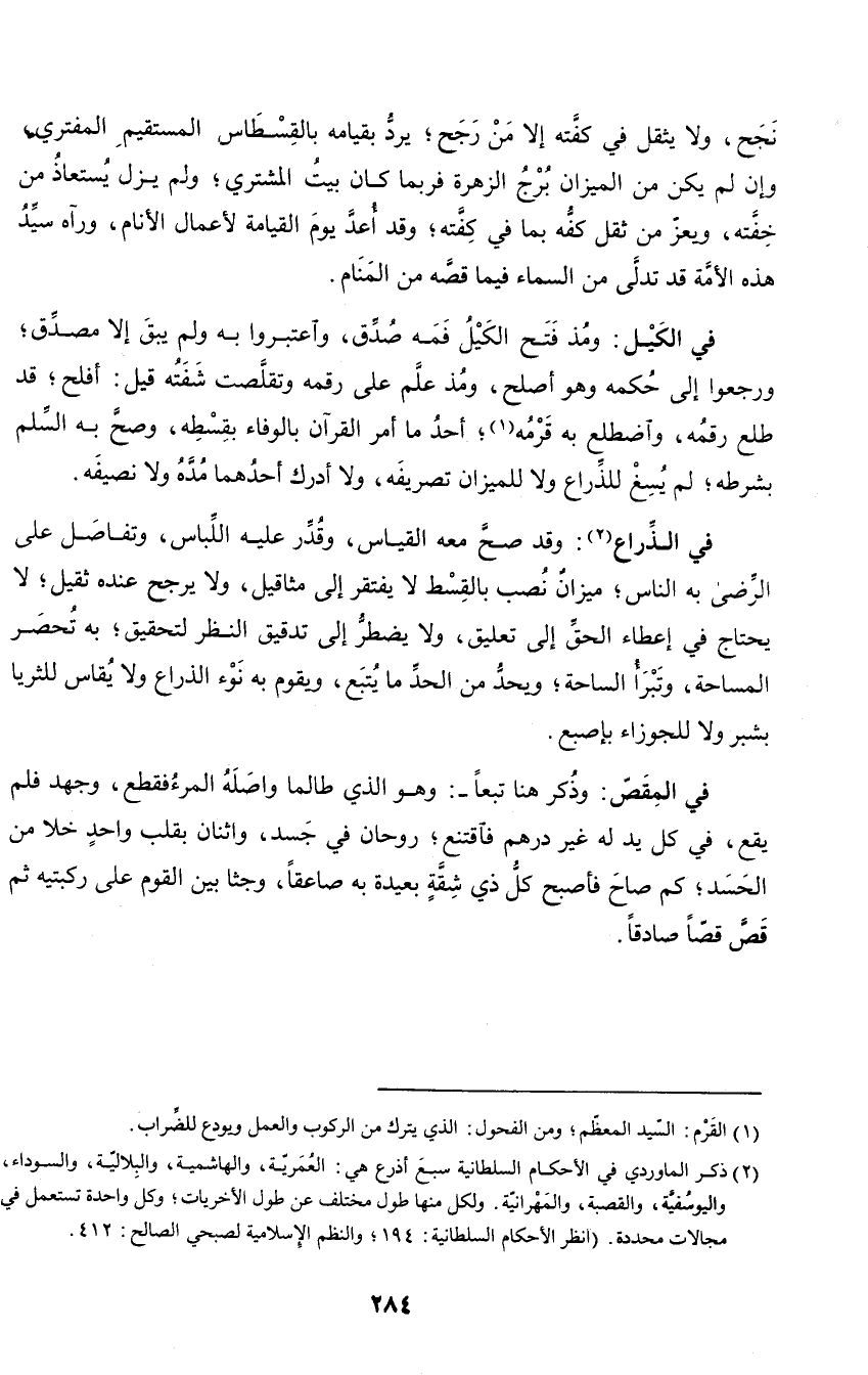 في الكيل: ومنذ فتح الكيل فمه صدق، واعتبروا به ولم يبق إلا مصدق؛ ورجعوا إلى حكمه وهو أصلح، ومذ علم على رقمه وتقلصت شفته قيل: أفلح؛ قد طلع رقمه، واضطلع به قرمه؛ أحد ما أمر القرآن بالوفاء بقسطه، وصح به السلم بشرطه؛ لم يسغ للذراع ولا للميزان تصريفه، ولا أدرك أحدهما مده ولا نصيفه.