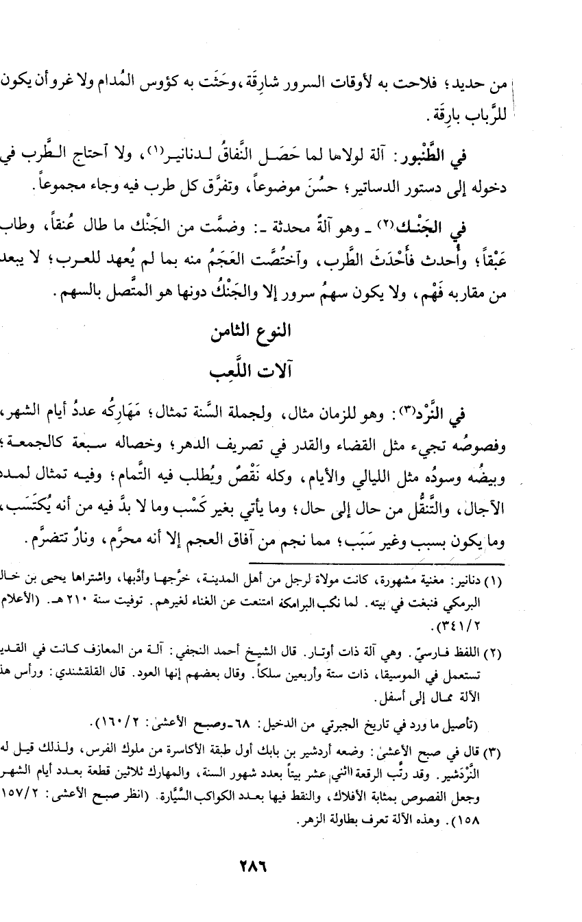 في الجنك - وهو آلة محدثة -: وضمت من الجنك ما طال عنقا، وطاب عبقا؛ وأحدث فأحدث الطرب، واختصت العجم منه بما لم يعهد للعرب؛ لا يبعد من مقاربه فهم، ولا يكون سهم سرور إلا والجنك دونها هو المتصل بالسهم.