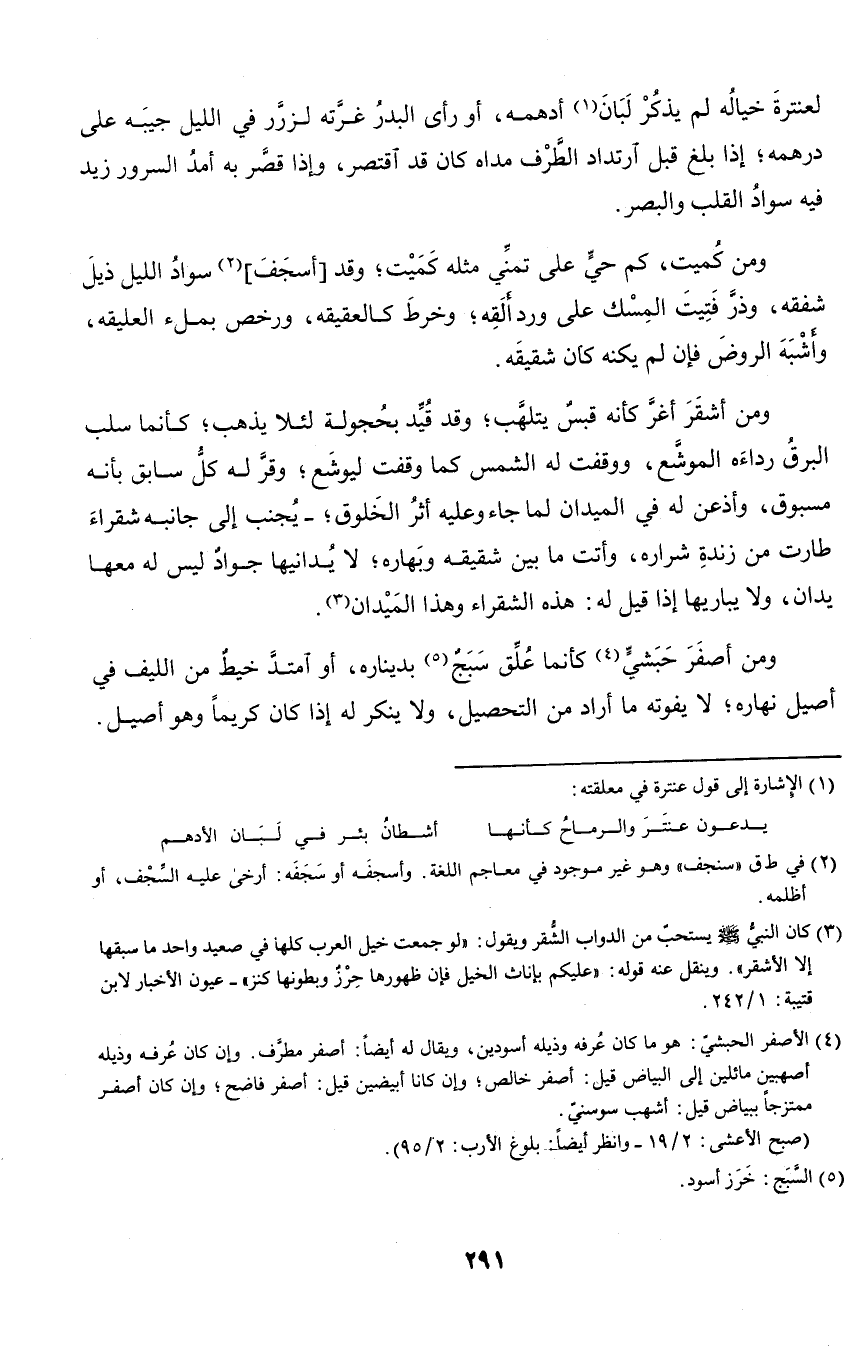 لعنترة خياله لم يذكر لبان أدهمه، أو رأى البدر غرته لزرر في الليل جيبه على درهمه؛ إذا بلغ قبل ارتداد الطرف مداه كان قد اقتصر، وإذا قصر به أمد السرور زيد فيه سواد القلب والبصر.