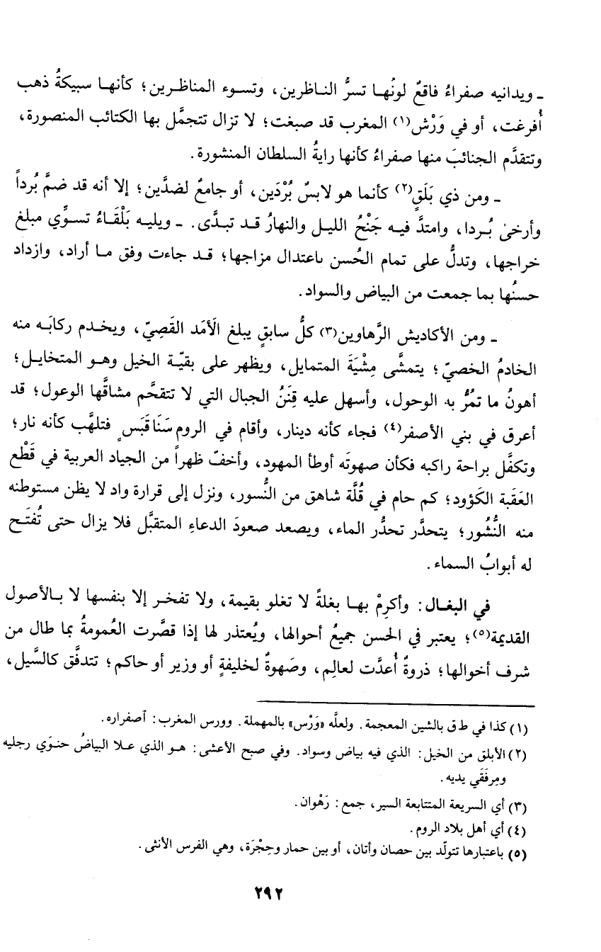 في البغال: وأكرم بها بغلة لا تغلو بقيمة، ولا تفخر إلا بنفسها لا بالأصول القديمة؛ يعتبر في الحسن جميع أحوالها، ويعتذر لها إذا قصرت العمومة بما طال من شرف أخوالها؛ ذروة أعدت لعالم، وصهوة لخليفة أو وزير أو حاكم؛ تتدفق كالسيل،