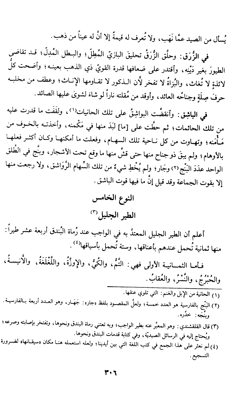اعلم أن الطير الجليل المعتد به في الواجب عند رماة البندق أربعة عشر طيرا: منها ثمانية تحمل عندهم بأعناقها، وستة تحمل بأسياقها.