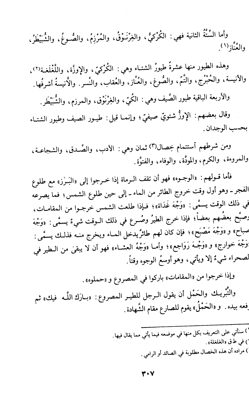 فأما قولهم: (الوجوه) فهو أن تقف الرماة إذا خرجوا إلى (البرز) مع طلوع الفجر - وهو أول وقت خروج الطائر من الماء - إلى حين طلوع الشمس؛ فما يصرعه في ذلك الوقت يسمى: (وجه غداة)؛ فإذا طلعت الشمس خرجوا من المقامات، وصبح بعضهم بعضا؛ فإذا خرج الطير وصرع في ذلك الوقت شيء يسمى: (وجه صباح) و (وجه مصبح)؛ فإذا كان لهم طائر يدخل الماء ويخرج منه فذلك يسمى: (وجه خوارج) و (وجه رواجع)؛ وأما (وجه العشاء) فهو أن لا يبقى من الطير في الصحراء شيء إلا ويأتي، وهو أوسع الوجوه وقتا.