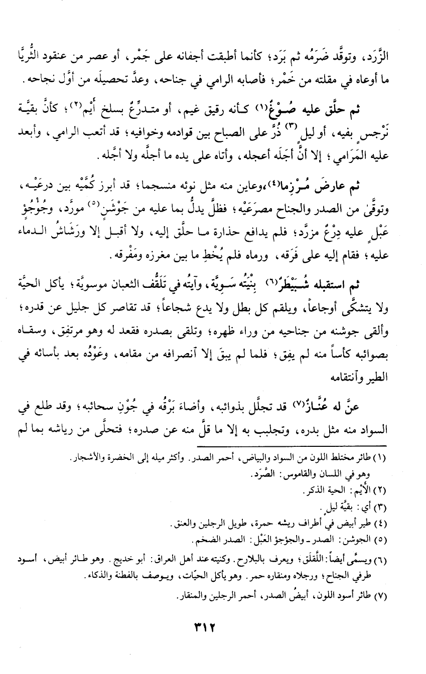 ثم حلق عليه صوغ كأنه رقيق غيم، أو متدرع بسلخ أيم؛ كأن بقية نرجس بفيه، أو ليل ذر على الصباح بين قوادمه وخوافيه؛ قد أتعب الرامي، وابعد عليه المرامي؛ إلا أن أجله
