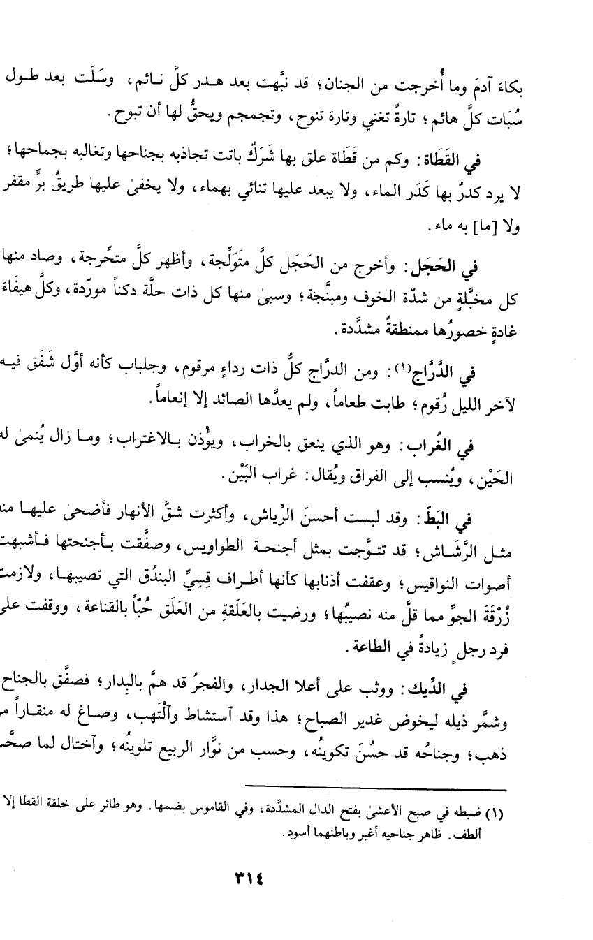 في الدراج: ومن الدراج كل ذات رداء موقوم، وجلباب كأنه أول شفق فيه لآخر رقوم، طابت طعاما، ولم يعدها الصائد إلا أنعاما.