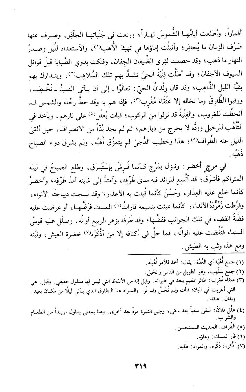 أن يأتي الصيد - نحطب، ورقبوا الطارق وما نخاله إلا عنقاء مغرب؛ فإذا هم به وقد حط رحله والشمس قد انحطت للغروب، والفتية قد نزلوا من الركوب؛ فبات يعلل على نارهم، ويأخذ في التأهب للرحيل ووده لا يخرج من ديارهم؛ ثم لم يجد بدا من الانصراف، حين ألقى الليل عنه الطراف؛ هذا وخطيب الدجى لم يتمزق أهبه، ولم يشرق دواء الصباح ذهبه.