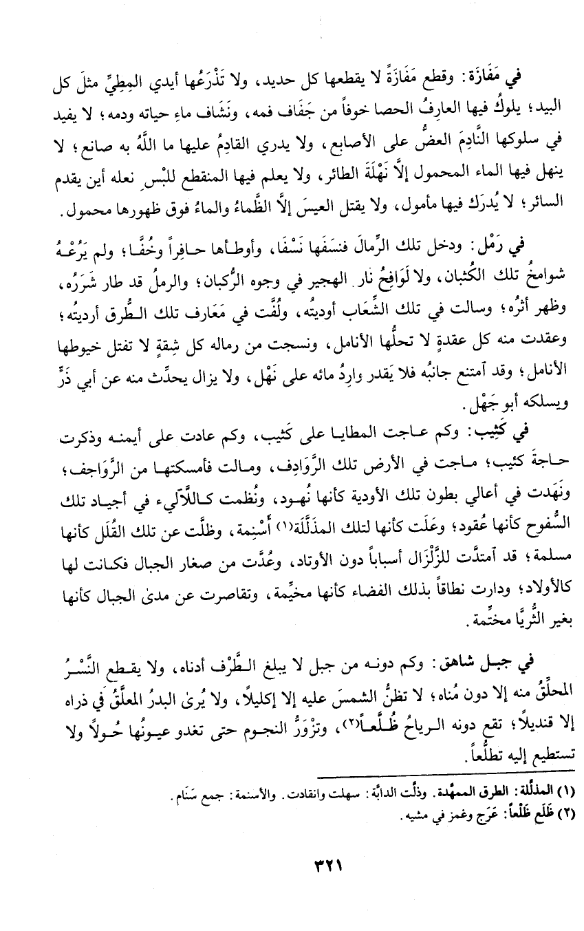 في كثيب: وكم عاجت المطايا على كثيب، وكم عادت على أيمنه وذكرت حاجة كئيب؛ ماجت في الأرض تلك الروادف، ومالت فأمسكتها من الرواجف؛ ونهدت في أعالي بطون تلك الأودية كأنها نهود، ونظمت كاللآليء في أجياد تلك السفوح كأنها عقود؛ وعلت كأنها لتلك المذللة أسنمة، وظلت عن تلك القلل كأنها مسلمة؛ قد امتدت للزلزال أسبابا دون الأوتاد، وعدت من صغار الجبال فكانت لها كالأولاد؛ ودارت نطاقا بذلك الفضاء كأنها مخيمة، وتقاصرت عن مدى الجبال كأنها بغير الثريا مختمة.