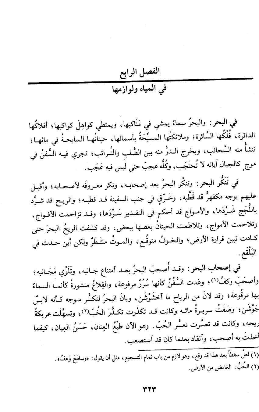 في إصحاب البحر: وقد أصحب البحر بعد امتناع جانبه، وتلوي مجانبه، وتلوي مجانبه؛ وأصحب وكف؛ وغدت السفن كأنها سرر مرفوعة، والقلاع منشورة كأنما السماء بها مرقوعة؛ وقد لان من الرياح ما اخشوشن، وبان البحر لتكسر موجه كأنه لابس جوشن؛ وصفت سريرة مائه وكانت قد تكدرت تكدر الخب، وتسهلت عريكة ريحه، وكانت قد تعسرت عسر الحب. وهو الآن طيع العنان، حسن العيان، كيفما أخذت به أصحب، وانقاد بعدما كان قد استصعب.