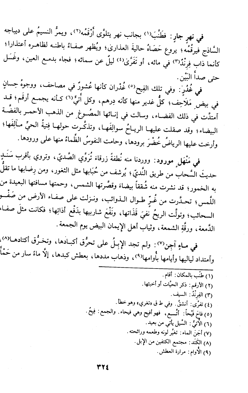 في منهل مورود: ووردنا منه نطفة زرقاء تروي الصدي، وتروي بأقرب سند حديث السحاب من طريق الندي؛ يرشف من حبابها مثل الثغور، ومن رضابها ما تقل به الخمور؛ قد نشرت منه شققا بيضاء وقصرتها الشمس، وحمتها مسافتها البعيدة من اللمس؛ تحدرت من غر طوال الذوائب، ونزلت على صفاء الأرض من صفو السحائب؛ وتولت الريح نفي قذاتها، ونفع شاربيها بدفع أذاتها؛ فكانت مثل صفاء الدمعة، ورقة الشمعة، وثياب أهل