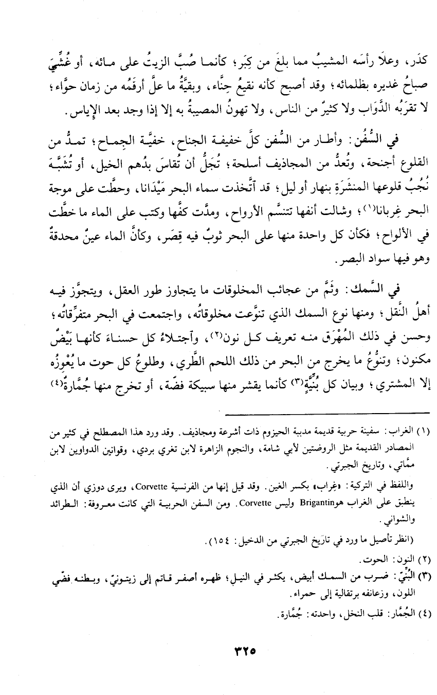 في السمك: وثم من عجائب المخلوقات ما يتجاوز طور العقل، ويتجوز فيه أهل النقل؛ ومنها نوع السمك الذي تنوعت مخلوقاته، واجتمعت في البحر متفرقاته؛ وحسن في ذلك المهرق منه تعريف كل نون، واجتلاء كل حسناء كأنها بيض مكنون؛ وتنوع ما يخرج من البحر من ذلك اللحم الطري، وطلوع كل حوت ما يعوزه إلا المشتري؛ وبيان كل بنية كأنما يقشر منها سبيكة فضة، أو تخرج منها جمارة