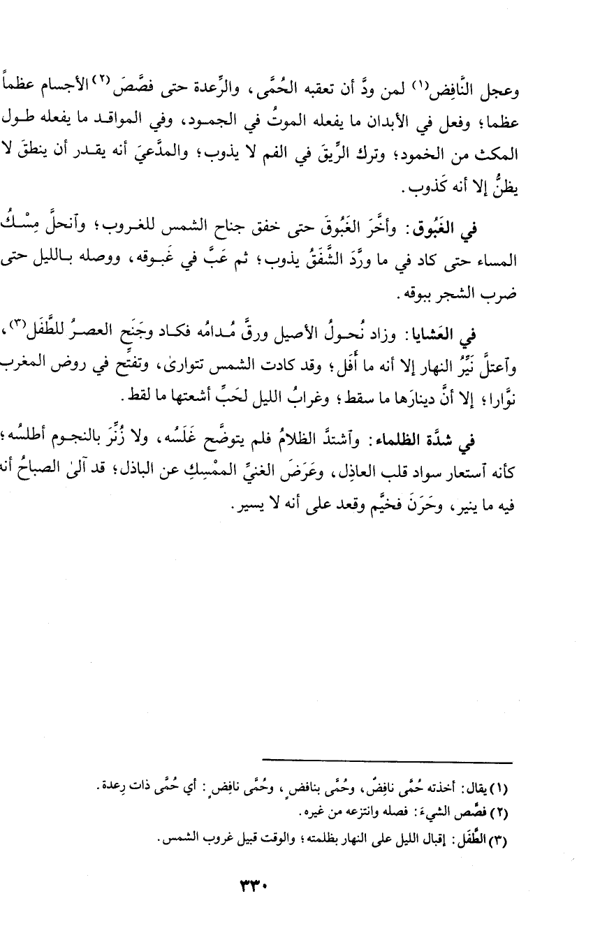 في العشايا: وزاد نحول الأصيل ورق مدامه فكاد وجنح العصر للطفل، واعتل نير النهار إلا أنه ما أفل؛ وقد كادت الشمس تتوارى، وتفتح في روض المغرب نوارا؛ إلا أن دينارها ما سقط؛ وغراب الليل لحب أشعتها ما لقط.