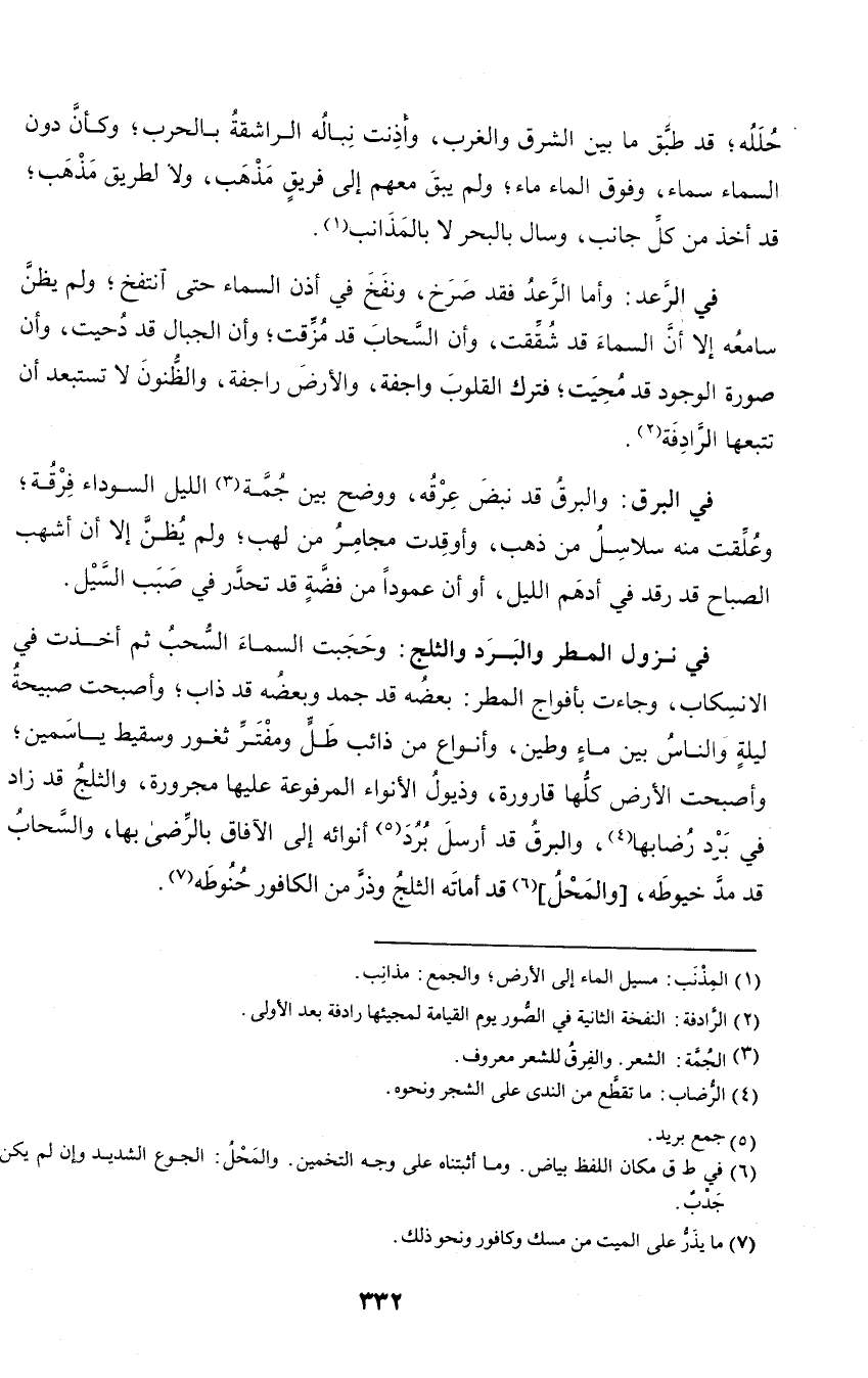 في الرعد: وأما الرعد فقد صرخ، ونفخ في أذن السماء حتى انتفخ؛ ولم يظن سامعه إلا أن قد شققت، وأن السحاب قد مزقت؛ وأن الجبال قد دحيت، وأن صورة الوجود قد محيت؛ فترك القلوب واجفة، والأرض راجفة، والظنون لا تستبعد أن تتبعها الرادفة.
