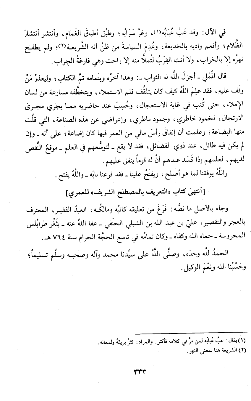 قال المملي - أجزل الله له الثواب -: وهذا آخره وبتمامه ثم الكتاب؛ وليعذر من وقف عليه، فقد علم الله كيف كان يتلقف قلم الاستملاء، ويتخطفه مسارعة من لسان الإملاء، حتى كتب في غاية الاستعجال، وحسب عند حاضريه مما يجري مجرى الارتجال، لخمود خاطري، وجمود ماطري، وإعراضي عن هذه الصناعة، التي قلت منها البضاعة؛ وعلمت أن إنفاق رأس مالي من العمر فيها كان إضاعة؛ على أنه - وإن لم يكن فيه طائل، عند ذوي الفضائل، فقد لا يقع - لتوسعهم في العلم - موقع النقص لديهم، لعلمهم إذا كسد عندهم