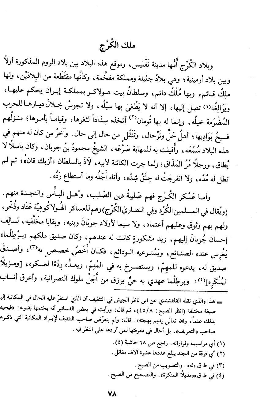 وأما عسكر الكرج فهم صليبة دين الصليب، وأهل البأس والنجدة منهم. (ويقال في المسلمين الكرد وفي النصارى الكرج) وهم للعساكر الهولاكوهية عتاد وذخر، ولهم بهم وثوق وعليهم اعتماد، ولا سيما لأولاد جوبان وبنيه، وبقايا مخلفيه، لسالف إحسان جوبان إليهم، ويد مشكورة كانت له عندهم، وكان صديق ملكهم (برطلما) يغرس عنده الصنائع، ويسترعيه الودائع، فكان أخص خصص به، وأصدق صديق له، يدعوه للمهم، ويستصرخ به في الملم، ويعده رداءا لعسكره، ومزيلا لمنكره، وبرطلما عهدي به حي يرزق من أجل ملوك النصرانية، وأعرق انساب