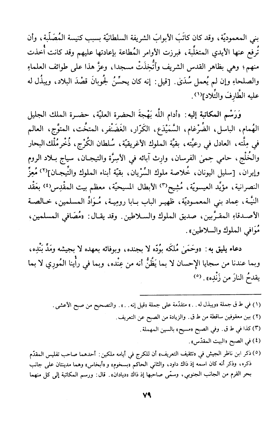 ورسم المكاتبة إليه: (أدام الله بهجة الحضرة العلية، حضرة الملك الجليل الهمام، الباسل، الضرغام، السميدع، الكرار، الغضنفر، المتخت، المتوج، العالم في ملته، العادل في رعيته، بقية الملوك الأغريقية، سلطان الكرج، ذخر ملك البحار والخلج، حامي حمى الفرسان، وارث آبائه في الأسرة والتيجان، سياج بلاد الروم وإيران، سليل اليونان، خلاصة ملوك السريان، بقية أبناء الملوك والتيجان معز النصرانية، مؤيد العيسوية، مشيح الأبطال المسيحية، معظم بيت المقدس بعقد النية، عماد بني المعمودية، ظهير الباب بابا رومية، مواد المسلمين، خالصة الأصدقاء المقربين، صديق الملوك والسلاطين. وقد يقال: (مصافي المسلمين، موافي الملوك والسلاطين).