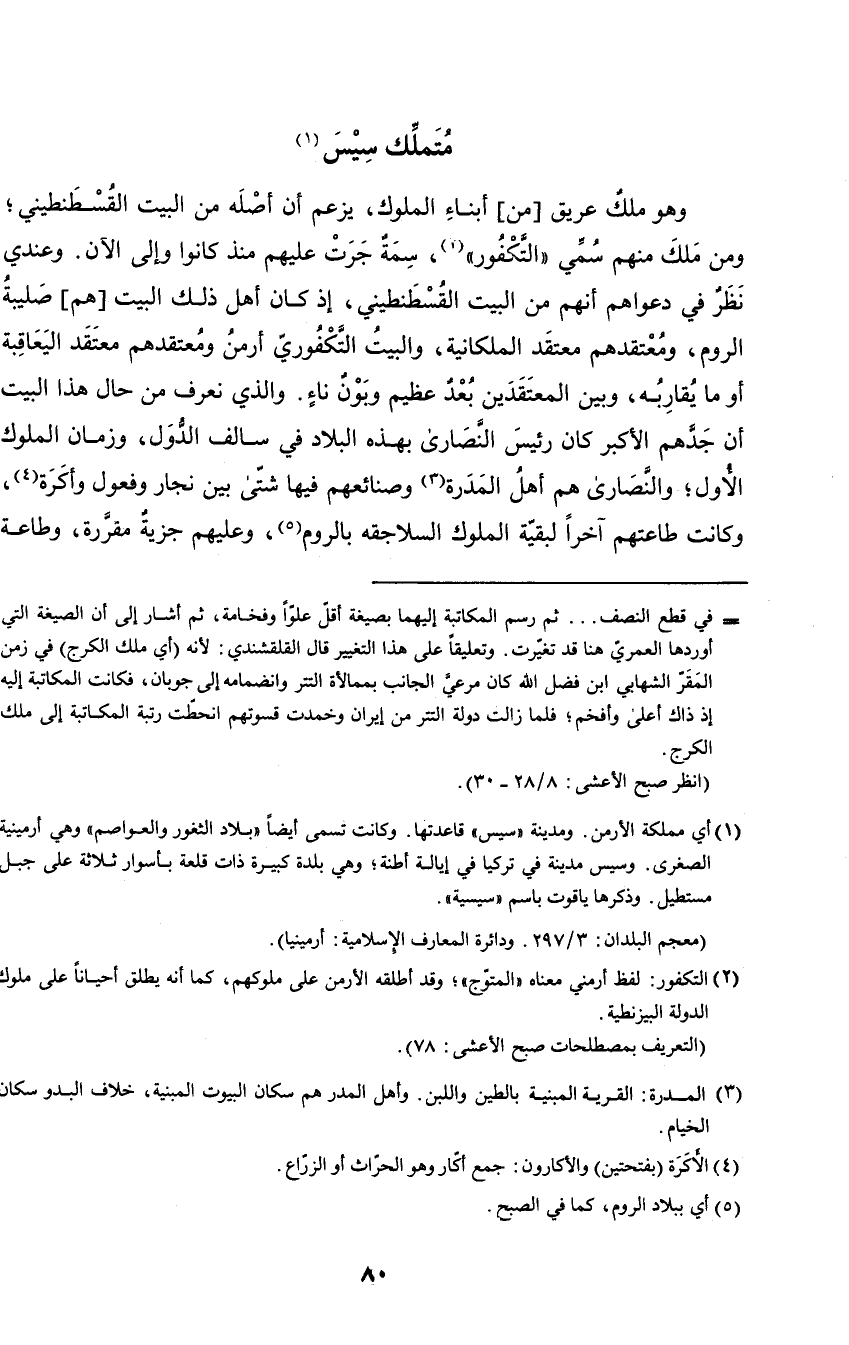 وهو ملك عريق من أبناء الملوك، يزعم أن أصله من البيت القسطنطيني؛ ومن ملك منهم سمي (التكفور)، سمةجرت عليهم منذ كانوا وإلى الآن. وعندي نظر في دعواهم أنهم من البيت القسطنطيني، إذ كان أهل ذلك البيت هم صليبة الروم، ومعتقدهم معتقد الملكانية، والبيت التكفوري أرمن ومعتقدهم معتقد اليعاقبة أو ما يقاربه، وبين المعتقدين بعد عظيم وبون ناء. والذي نعرف من حال هذا البيت أن جدهم الأكبر كان رئيس النصارى بهذه البلاد في سالف الدول، وزمان الملوك الأول، والنصارى هم أهل المدرة وصنائعهم فيها شتى بين نجار وفعول وأكرة، وكانت طاعتهم آخرا لبقية الملوك السلاجقة بالروم، وعليهم جزية مقررة، وطاعة