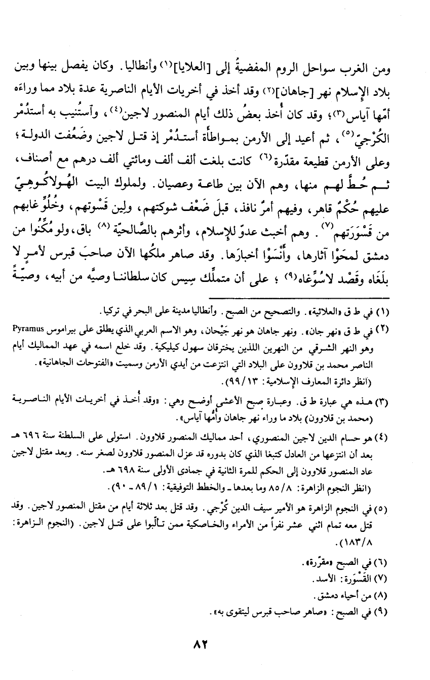 ومن الغرب سواحل الروم المفضية إلى العلايا وأنطاليا. وكان يفصل بينها وبين بلاد الإسلام نهر جاهان وقد أخذ في أخريات الأيام الناصرية عدة بلاد مما وراءه أمها آياس؛ وقد كان أخذ بعض ذلك أيام المنصور لاجين، واستنيب به أستدمر الكرجي، ثم أعيد إلى الأرمن بمواطأة أستدمر إذ قتل لاجين وضعفت الدولة، وعل الأرمن قطيعة مقدرة كانت بلغت ألف ألف ومائتي ألف درهم مع أصناف، ثم حط لهم منها، وهم الآن بين طاعة وعصيان. ولملوك البيت الهولاكوهي عليهم حكم قاهر، وفيهم أمر نافذ، قبل ضعف شوكتهم، ولين قسوتهم، وخلو غابهم من قسورتهم. وهم أخبث عدو للإسلام، وأثرهم بالصالحية باق، ولو مكنوا من دمشق لمحوا آثارها، وأنسوا أخبارها. ولقد صاهر ملكها الآن صاحب قبرص لأمر لا بلغاه وقصد لا سوغاه؛ على أن متملك سيس كان سلطاننا وصيه من أبيه، وصية
