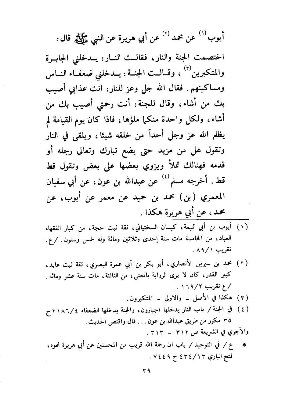 "اخْتصمت الْجَنَّةُ وَالنَّارُ، فَقَالَتِ النَّارُ: يَدْخُلُنِي الجبَابرة والمتكبرين3، وَقَالَتِ الْجَنَّةُ: يَدْخُلُنِي ضُعَفَاءُ النَّاسِ ومَسَاكِينُهُمْ. فَقَالَ اللَّهُ جَلَّ وَعَزَّ لِلنَّارِ: أنتِ عَذَابِي أُصِيبُ بِكِ مَنْ أَشَاءُ، وَقَالَ لِلْجَنَّةِ: أنتِ رَحْمَتِي أُصِيبُ بِكِ مَنْ أَشَاءُ، وَلِكُلِّ وَاحِدَةٍ مِنْكُمَا مِلْؤُهَا، فَإِذَا كَانَ يَوَمُ الْقِيَامَةِ لَمْ يَظْلِمِ اللَّهُ عَزَّ وَجَلَّ أَحَدًا مِنْ خَلْقِهِ شَيْئًا، ويُلْقَى فِي النَّارِ وَتَقُولُ هَلْ مِنْ مَزِيدٍ؟ حَتَّى يَضَعَ تَبَارَكَ وَتَعَالَى رِجْلَهُ -أَوْ قَدَمَهُ- فَهُنَالِكَ تُمْلَأُ وَيُزْوَى بَعْضُهَا عَلَى بَعْضٍ وَتَقُولُ: قَطْ قَطْ". أَخْرَجَهُ مُسْلِمٌ4 عَنْ عَبْدِ اللَّهِ بْنِ عَوْنٍ، عَنْ أَبِي سُفْيَانَ الْمَعْمَرِيِّ بْنِ مُحَمَّدِ بْنِ حُمَيْدٍ، عَنْ مَعْمَرٍ، عَنْ أَيُّوبَ، عن محمد، عن أبي هريرة هكذا.
