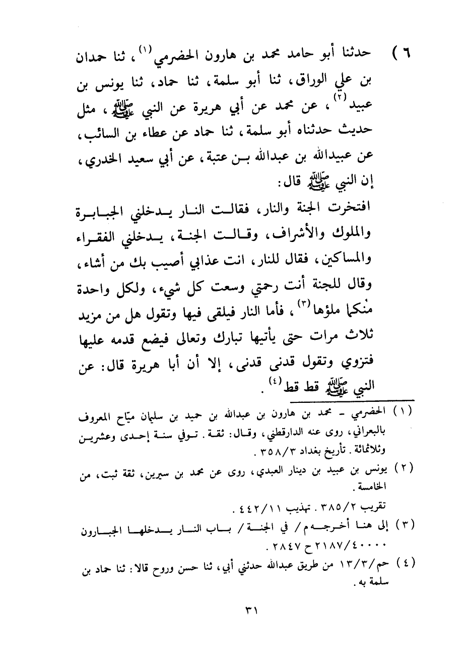 6 حدَّثنا أَبُو حَامِدٍ مُحَمَّدُ بْنُ هَارُونَ الْحَضْرَمِيُّ1، ثنا حِمْدانُ بْنُ عَلِيٍّ الْوَرَّاقُ، ثنا أَبُو سَلَمَةَ، ثنا حَمَّادٌ، ثنا يُونُسُ بْنُ عُبَيْدٍ2، عَنْ مُحَمَّدٍ عَنْ أَبِي هُرَيْرَةَ عَنِ النَّبِيِّ صلَّى اللهُ عَلَيْهِ وَسَلَّمَ، مِثْلَ حَدِيثٍ حَدَّثَنَاهُ أو سَلَمَةَ، ثنا حَمَّادٌ عَنْ عَطَاءِ بْنِ السَّائِبِ، عَنْ عُبَيْدِ اللَّهِ بْنِ عَبْدِ اللَّهِ بْنِ عُتْبَةَ، عَنْ أَبِي سَعِيدٍ الْخُدْرِيِّ، أَنَّ النَّبِيَّ صلَّى اللهُ عَلَيْهِ وَسَلَّمَ قَالَ: