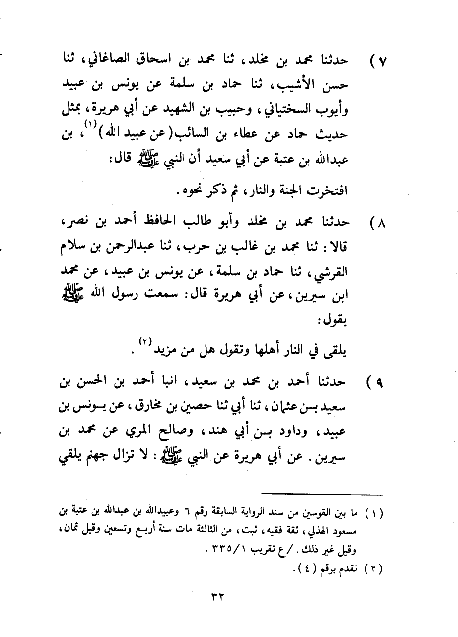 9 حَدَّثَنَا أَحْمَدُ بْنُ مُحَمَّدِ بْنِ سَعِيدٍ، أنبا أَحْمَدُ بْنُ الْحَسَنِ بْنِ سَعِيدِ بْنِ عُثْمَانَ، ثنا أَبِي ثنا حُصَيْنُ بْنُ مُخَارِقٍ، عَنْ يُونُسَ بْنِ عُبَيْدٍ، وَدَاوُدَ بْنِ أَبِي هِنْدٍ، وَصَالِحٍ الْمُرِّيِّ عَنْ مُحَمَّدِ بْنِ سِيرِينَ. عَنْ أَبِي هُرَيْرَةَ عَنِ النَّبِيِّ صلَّى اللهُ عَلَيْهِ وسلم: "لا تزال جهنم يلقى