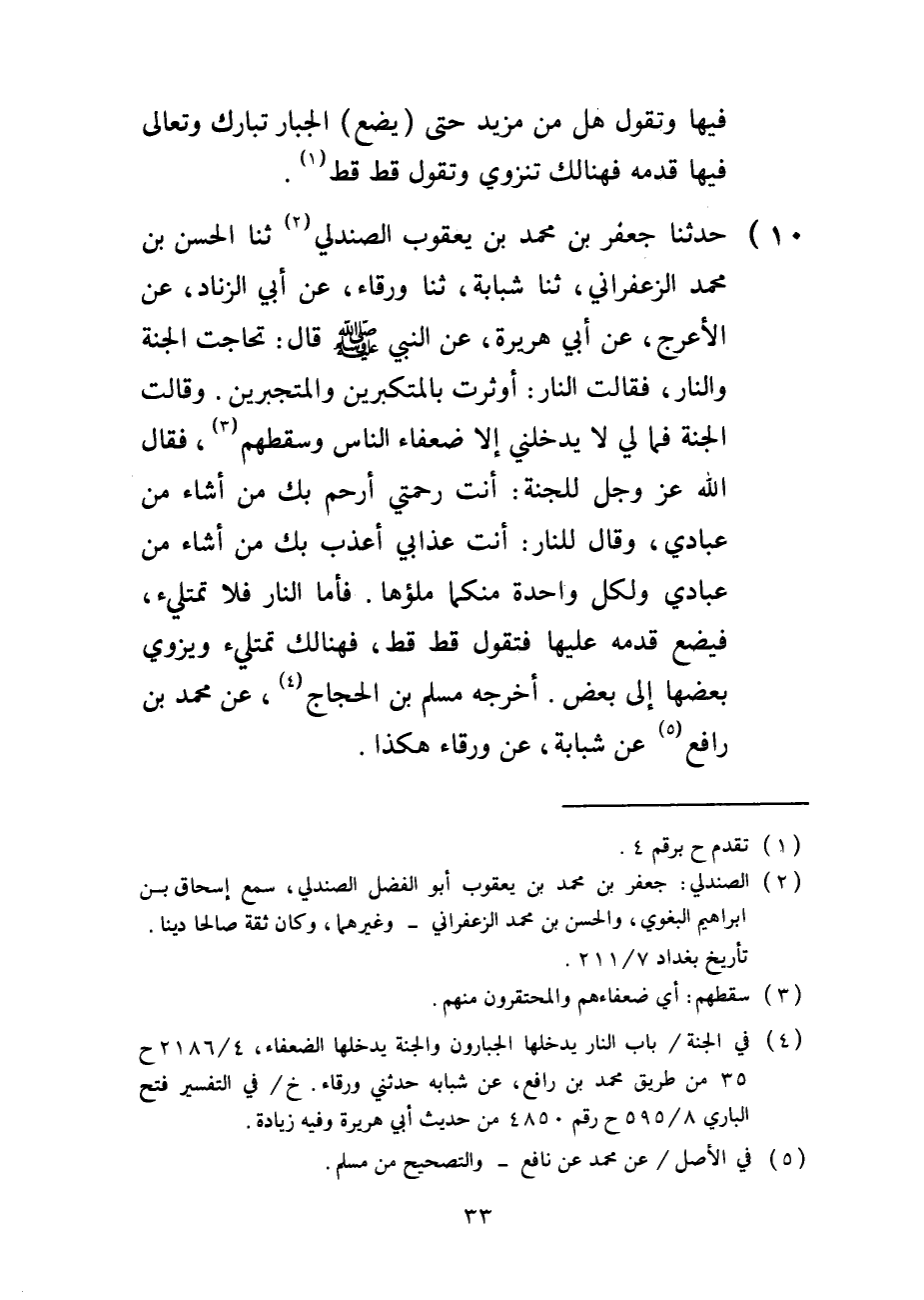 10 حَدَّثَنَا جَعْفَرُ بْنُ مُحَمَّدِ بْنِ يَعْقُوبَ الصَّنْدَلِيُّ2 ثنا الْحَسَنُ بْنُ مُحَمَّدٍ الزَّعْفَرَانِيُّ، ثنا شَبَابَةُ، ثنا وَرْقَاءُ، عَنْ أَبِي الزِّنَادِ، عَنِ الْأَعْرَجِ، عَنْ أَبِي هُرَيْرَةَ، عَنِ النَّبِيِّ صَلَّى اللهُ عَلَيْهِ وَسَلَّمَ قَالَ: "تَحَاجَّتِ الْجَنَّةُ وَالنَّارُ، فَقَالَتِ النَّارُ: أُوثِرْتُ بِالْمُتَكَبِّرِينَ وَالْمُتَجَبِّرِينَ. وَقَالَتِ الْجَنَّةُ: فَمَا لِي لَا يَدْخُلُنِي إِلَّا ضُعَفَاءُ النَّاسِ وَسَقَطُهُمُ3، فَقَالَ اللَّهُ عَزَّ وَجَلَّ لِلْجَنَّةِ: أَنْتِ رَحْمَتِي أَرْحَمُ بِكِ مَنْ أَشَاءُ مِنْ عِبَادِي، وَقَالَ لِلنَّارِ: أَنْتِ عَذَابِي أُعَذِّبُ بِكِ مَنْ أَشَاءُ مِنْ عِبَادِي وَلِكُلِّ وَاحِدَةٍ مِنْكُمَا مِلْؤُهَا. فَأَمَّا النَّارُ فَلَا تَمْتَلِئُ، فَيَضَعُ قدمه عليها فتقول قط قط، فهناك تَمْتَلِئُ وَيُزْوَى بَعْضُهَا إِلَى بَعْضٍ". أَخْرَجَهُ مُسْلِمُ بْنُ الْحَجَّاجِ 4، عَنْ مُحَمَّدٍ بْنِ رَافِعٍ 5 عَنْ شبابة، عن ورقاء هكذا.