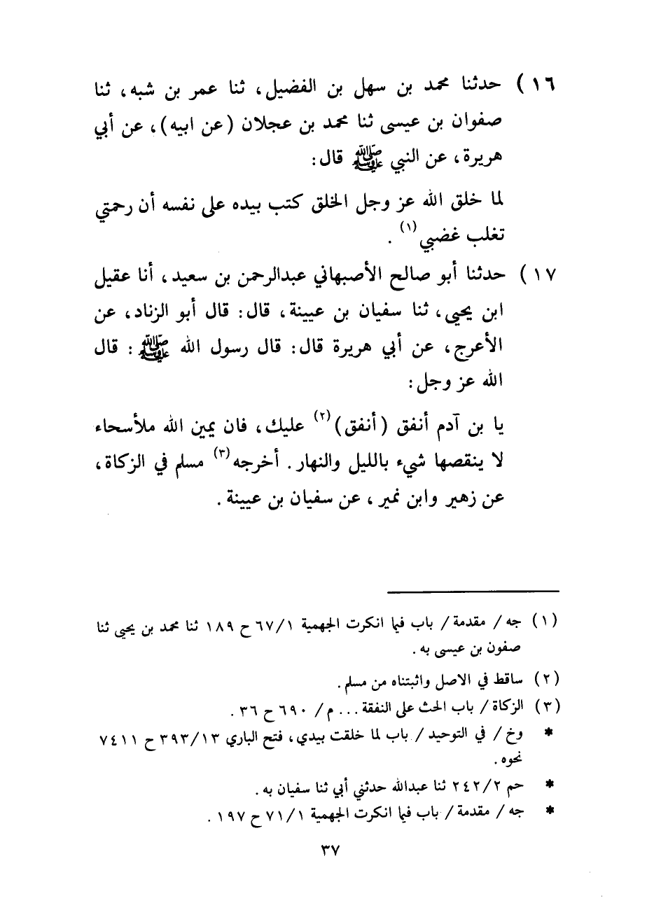 يا بن آدَمَ أَنْفِقْ أُنْفِقْ2 عَلَيْكَ، فَإِنَّ يَمِينَ اللَّهِ ملأ سَحَّاءُ لَا يُنْقِصُهَا شَيْءٌ بِاللَّيْلِ وَالنَّهَارِ". أَخْرَجَهُ3 مُسْلِمٌ فِي الزَّكَاةِ، عَنْ زُهَيْرٍ وَابْنِ نُمَيْرٍ، عن سفيان بن عينية.