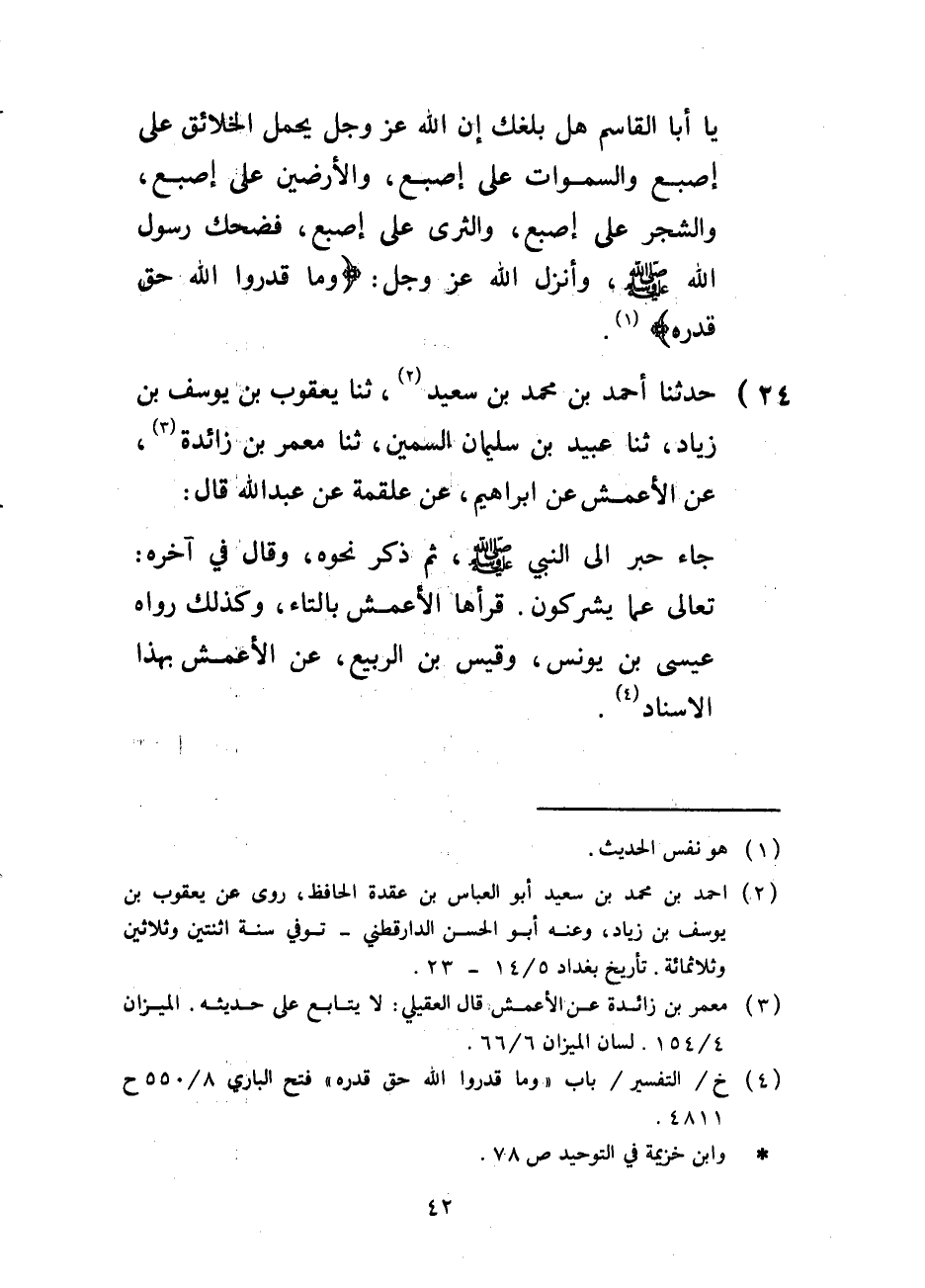 24 حَدَّثَنَا أَحْمَدُ بْنُ مُحَمَّدِ بْنِ سَعِيدٍ2، ثنا يَعْقُوبُ بْنُ يُوسُفَ بْنِ زِيَادٍ، ثنا عُبَيْدُ بْنُ سُلَيْمَانَ السَّمِينُ، ثنا مَعْمَرُ بْنُ زَائِدَةَ3، عَنِ الْأَعْمَشِ عَنْ إِبْرَاهِيمَ، عَنْ عَلْقَمَةَ عَنْ عَبْدِ اللَّهِ قَالَ: