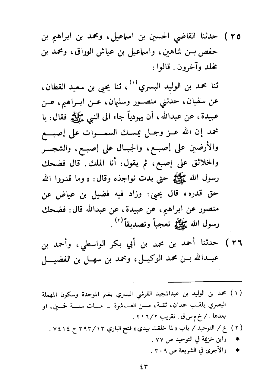 ثنا محمد بن الوليد البسري1، وثنا يحييى بْنُ سَعِيدٍ الْقَطَّانُ، عَنْ سُفْيَانَ، حَدَّثَنِي مَنْصُورٌ وَسُلَيْمَانُ، عَنْ إِبْرَاهِيمَ، عَنْ عُبَيْدَةَ، عَنْ عَبْدِ اللَّهِ، أَنَّ يَهُودِيًّا جَاءَ إِلَى النَّبِيِّ صلَّى اللهُ عَلَيْهِ وسلَّم فَقَالَ: يَا مُحَمَّدُ إِنَّ اللَّهَ عَزَّ وَجَلَّ يُمْسِكُ السَّمَوَات عَلَى إِصْبَعٍ وَالْأَرَضِينَ عَلَى إِصْبَعٍ، وَالْجِبَالَ عَلَى إِصْبَعٍ، وَالشَّجَرَ وَالْخَلَائِقَ عَلَى إِصْبَعٍ، ثُمَّ يَقُولُ: أَنَا الْمَلِكُ. قَالَ: فَضَحِكَ رَسُولُ اللَّهِ صلَّى اللهُ عَلَيْهِ وسلَّم حَتَّى بَدَتْ نَوَاجِذُهُ وَقَالَ: "وَمَا قَدَرُوا الله حق قدره" قَالَ يَحْيَى: وَزَادَ فِيهِ فُضَيْلُ بْنُ عِيَاضٍ عَنْ مَنْصُورٍ عَنْ إِبْرَاهِيمَ، عَنْ عُبَيْدَةَ، عَنْ عَبْدِ اللَّهِ قَالَ: فَضَحِكَ رَسُولُ اللَّهِ صلَّى اللهُ عَلَيْهِ وَسَلَّمَ تَعَجُّبًا وَتَصْدِيقًا2.