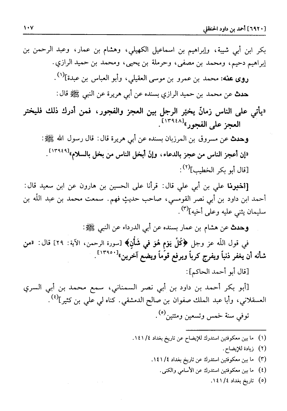 [أبو بكر أحمد بن داود بن أبي نصر السمناني، سمع محمد بن أبي السري العسقلاني، وأبا عبد الملك صفوان بن صالح الدمشقي. كناه لي علي بن كثير] «4» .