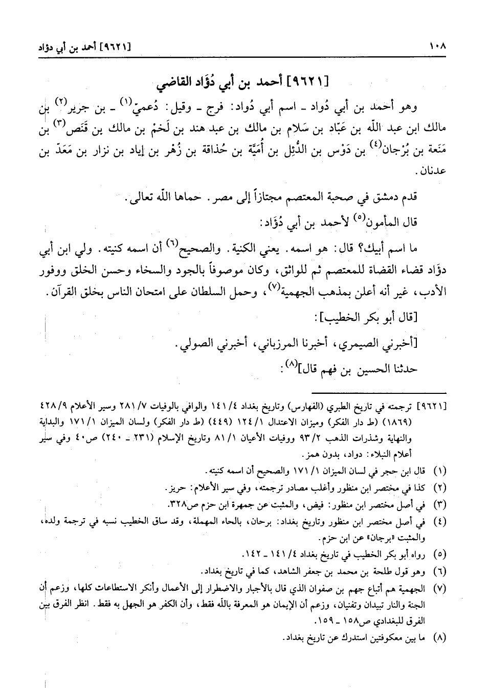 [9621] ترجمته في تاريخ الطبري (الفهارس) وتاريخ بغداد 4/141 والوافي بالوفيات 7/281 وسير الأعلام 9/428 (1869) (ط دار الفكر) وميزان الاعتدال 1/124 (449) (ط دار الفكر) ولسان الميزان 1/171 والبداية والنهاية وشذرات الذهب 2/93 ووفيات الأعيان 1/81 وتاريخ الإسلام (231- 240) ص 40 وفي سير أعلام النبلاء: دواد، بدون همز.