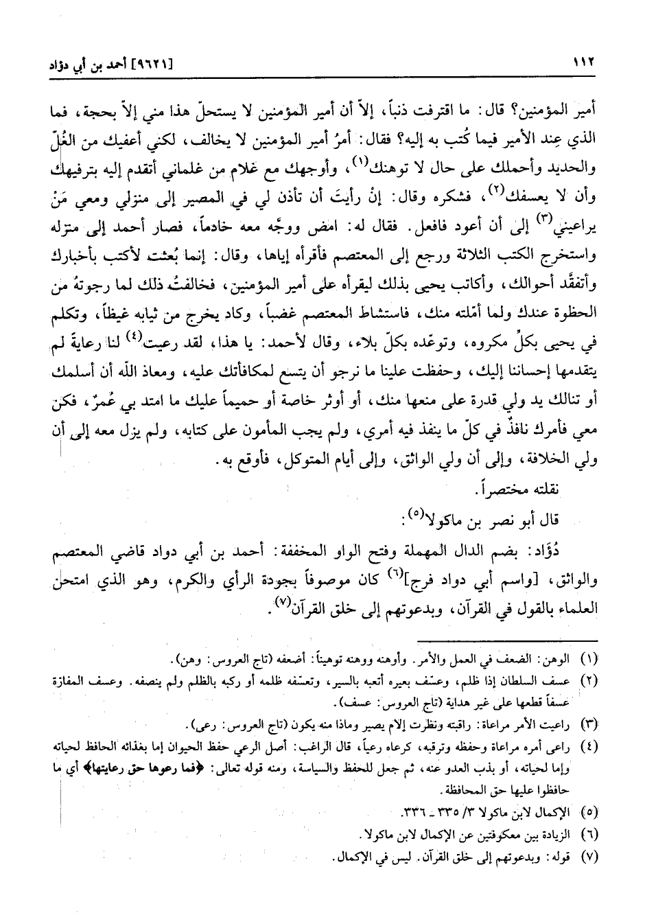 دؤاد: بضم الدال المهملة وفتح الواو المخففة: أحمد بن أبي دواد قاضي المعتصم والواثق، [واسم أبي دواد فرج] «6» كان موصوفا بجودة الرأي والكرم، وهو الذي امتحن العلماء بالقول في القرآن، وبدعوتهم إلى خلق القرآن «7» .