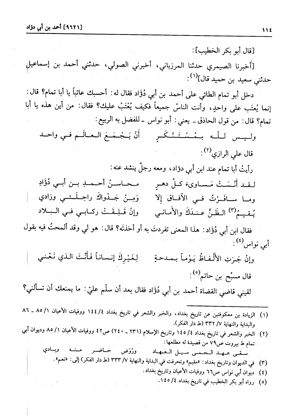 [أخبرنا الصيمري حدثنا المرزباني، أخبرني الصولي، حدثني أحمد بن إسماعيل حدثني سعيد بن حميد قال] «1» :