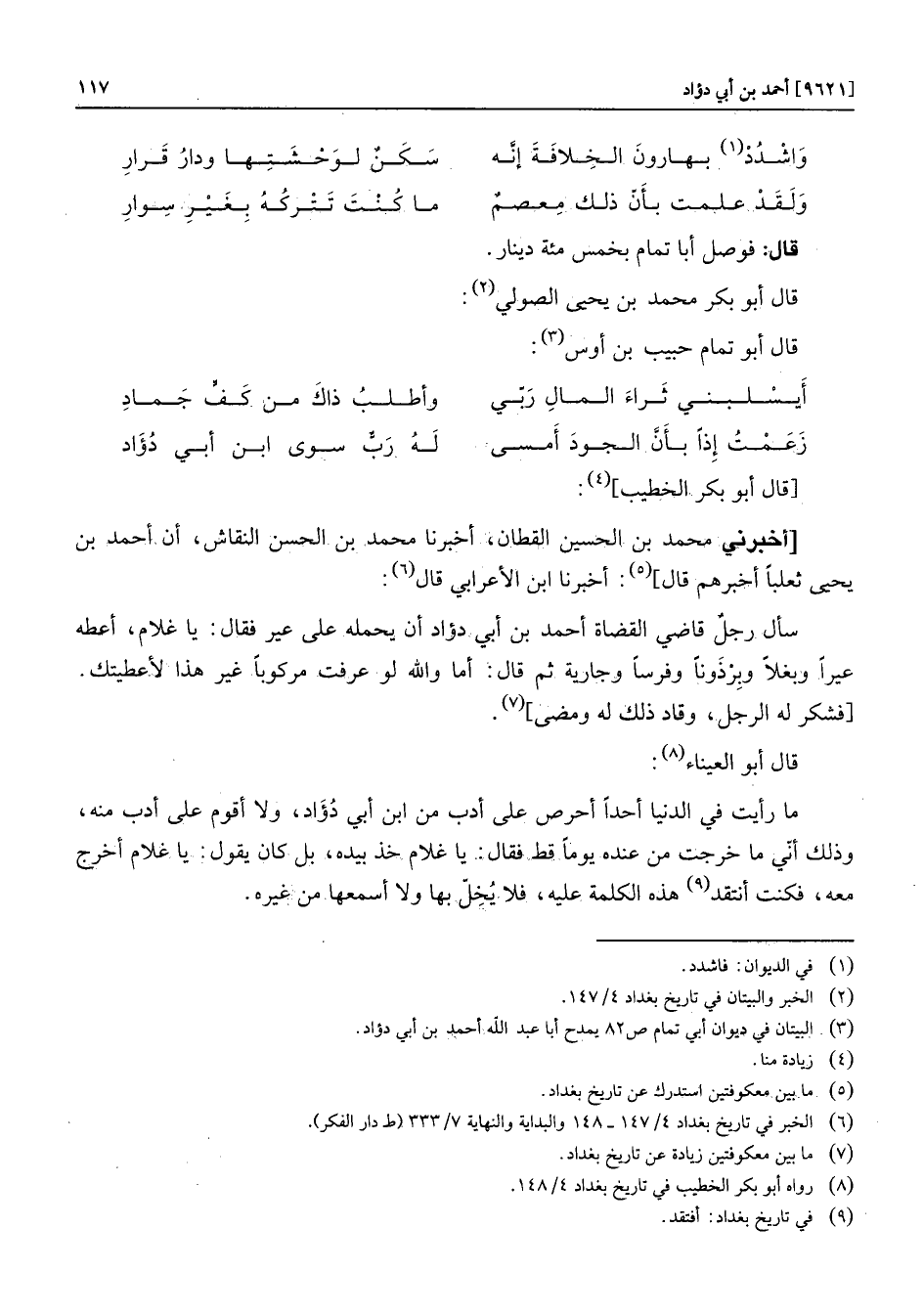 ما رأيت في الدنيا أحدا أحرص على أدب من ابن أبي دؤاد، ولا أقوم على أدب منه، وذلك أنّي ما خرجت من عنده يوما قط فقال: يا غلام خذ بيده، بل كان يقول: يا غلام أخرج معه، فكنت أنتقد «9» هذه الكلمة عليه، فلا يخلّ بها ولا أسمعها من غيره.